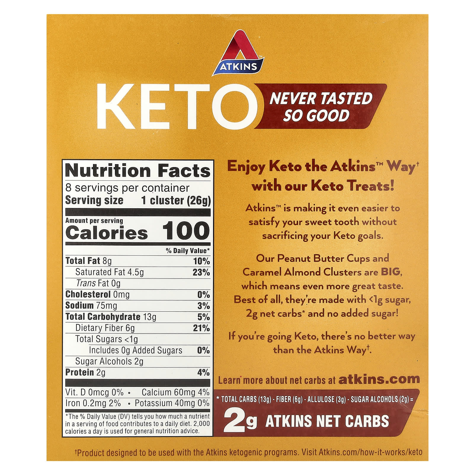 Наши конфеты с арахисовой пастой и карамелью с миндалем БОЛЬШИЕ, что означает еще более чудесный вкус. А лучше всего то, что они содержат < 1 г сахара, 2 г чистых углеводов* и не содержат добавленного сахара!