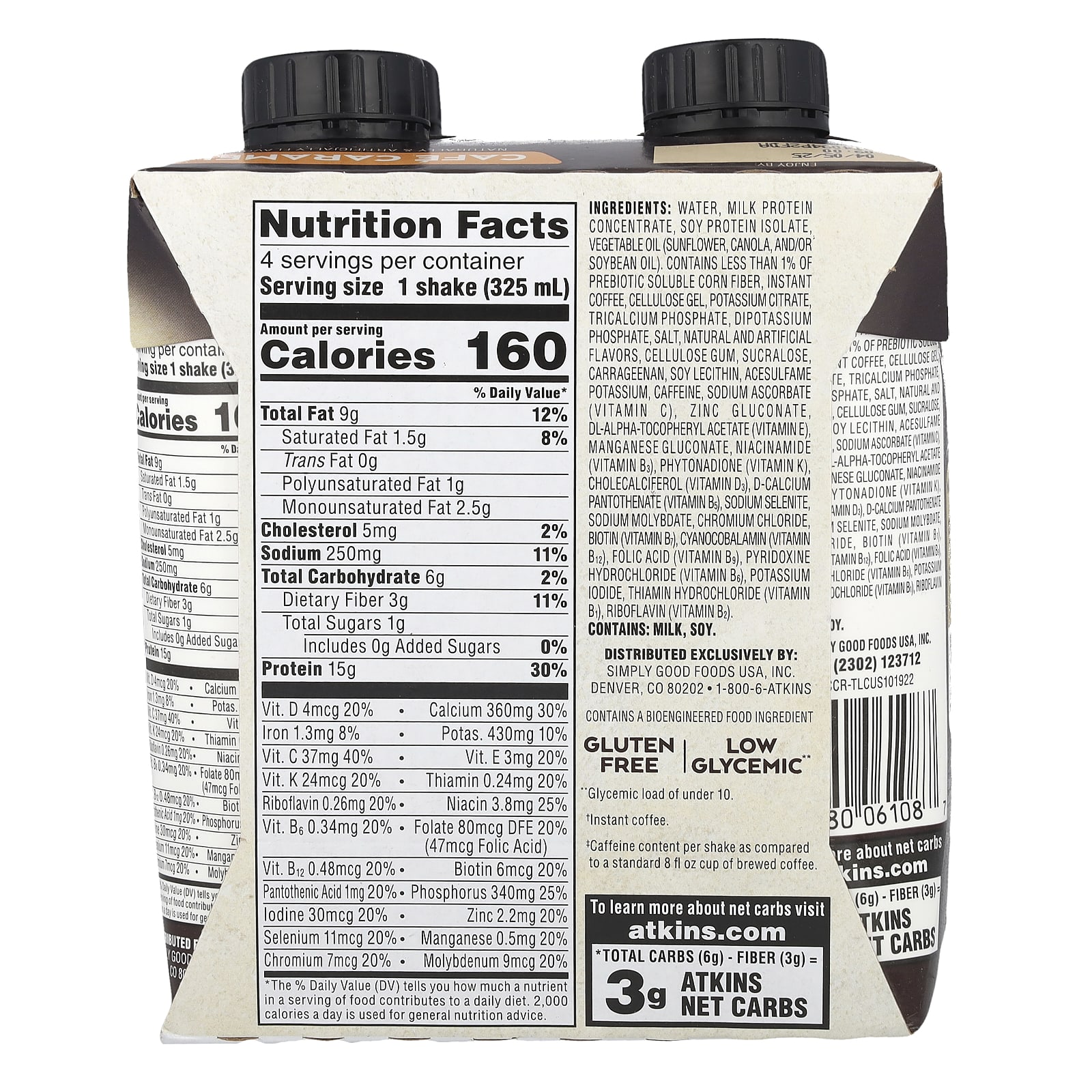 Вода, концентрат молочного протеина, изолят соевого протеина растительное масло (подсолнечное, канолы, и / или соевое масло). содержит менее 1% растворимой в пребиотиках кукурузной клетчатки, растворимый кофе, целлюлозный гель, цитрат калия, трикальцийфосфат, дикалийфосфат, соль, натуральные и искусственные ароматизаторы, целлюлозная камедь, сукралоза, каррагинан, соевый лецитин, ацесульфам калия, кофеин, аскорбат натрия (витамин С), глюконат цинка, dl-альфа-токоферилацетат (витамин Е) глюконат марганца, ниацинамид (витамин B3), фитонадион (витамин К), холекальциферол (витамин d3), d-пантотенат кальция (витамин B5), селенит натрия, молибдат натрия, хлорид хрома, биотин (витамин B7), цианокобаламин (витамин B12), фолиевая кислота (витамин B9), пиридоксина гидрохлорид (витамин B6), йодид калия, тиамина гидрохлорид (витамин B1), рибофлавин (витамин B2).