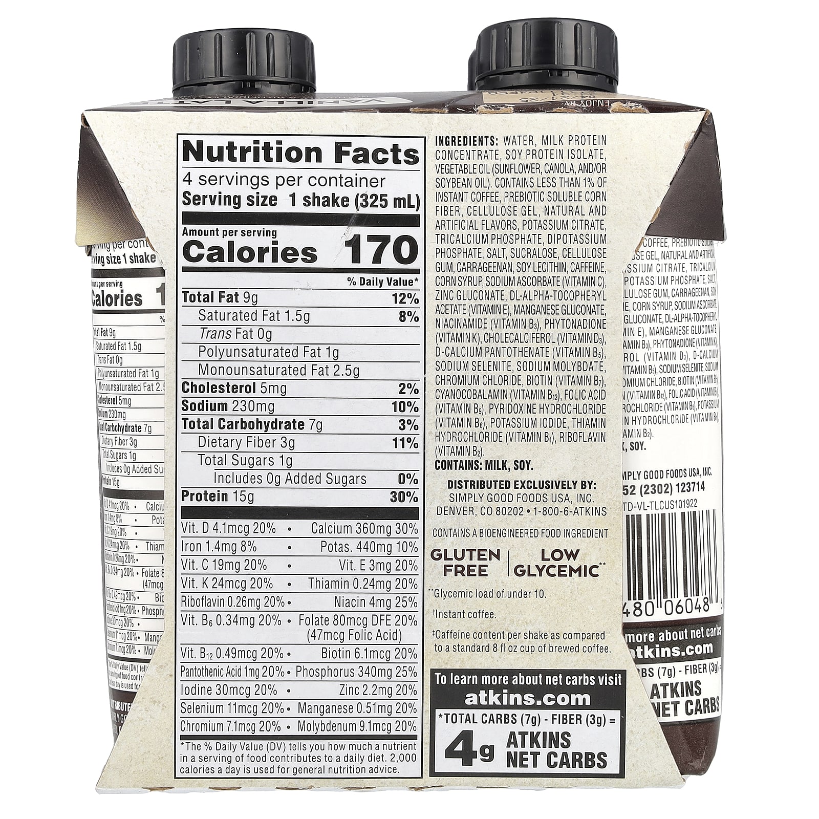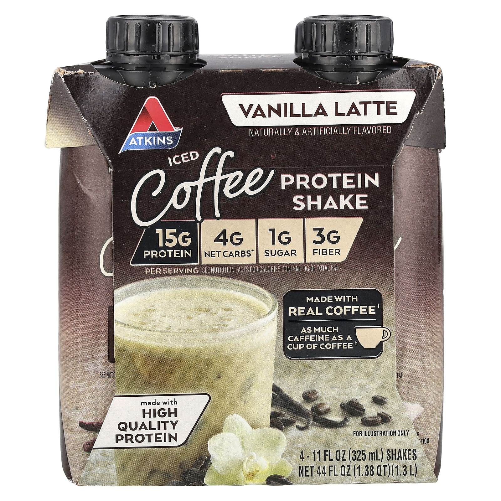 Вода, концентрат молочного протеина, изолят соевого белка, масло растительное (подсолнечное, канолы, и / или соевое масло). Содержит менее 1% растворимого кофе, растворимая кукурузная клетчатка с пребиотиками, целлюлозный гель, натуральные и искусственные ароматизаторы, цитрат калия, трикальцийфосфат, дикалийфосфат, соль, сукралоза, целлюлозная камедь, каррагинан, соевый лецитин, кофеин, кукурузный сироп, аскорбат натрия (витамин С), глюконат цинка, dl-альфа-токоферилацетат (витамин E), глюконат марганца, ниацинамид (витамин B3), фитонадион (витамин К), холекальциферол (витамин d3), d-пантотенат кальция (витамин B5), селенит натрия, молибдат натрия, хлорид хрома, биотин (витамин B7), цианокобаламин (витамин B12), фолиевая кислота (витамин B9), пиридоксина гидрохлорид (витамин B6), йодид калия, тиамина гидрохлорид (витамин B1), рибофлавин (витамин B2).