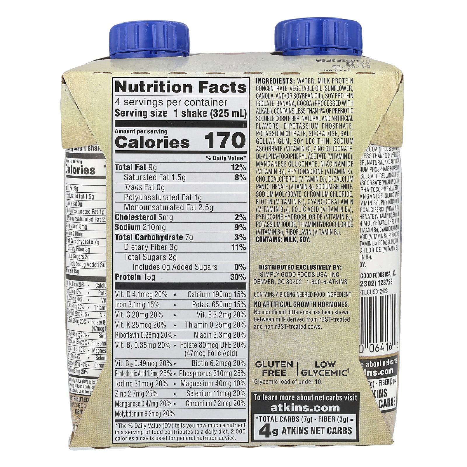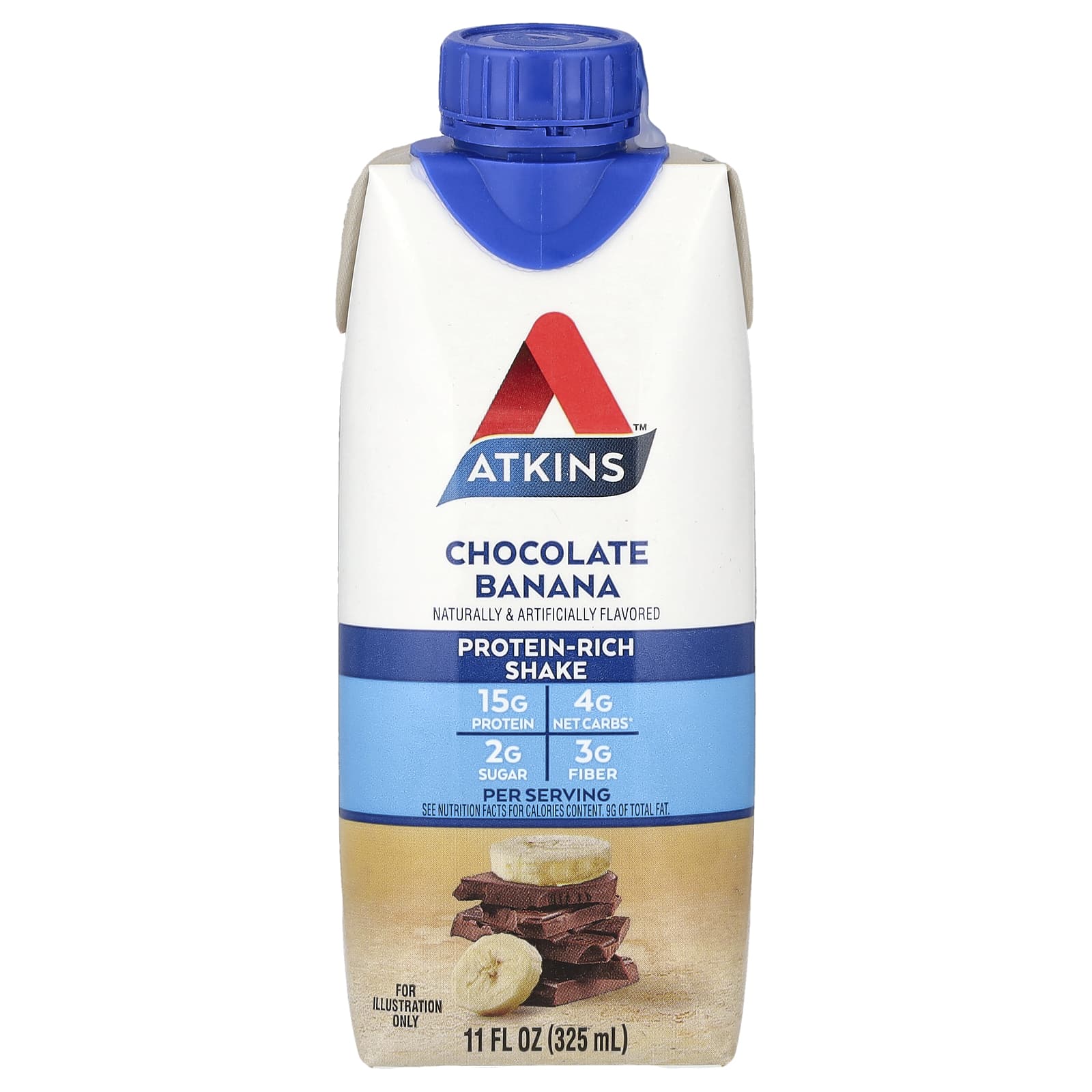 Atkins, Насыщенный протеином коктейль, шоколад и банан, 4 коктейля, 325 мл (11 жидк. унц.)