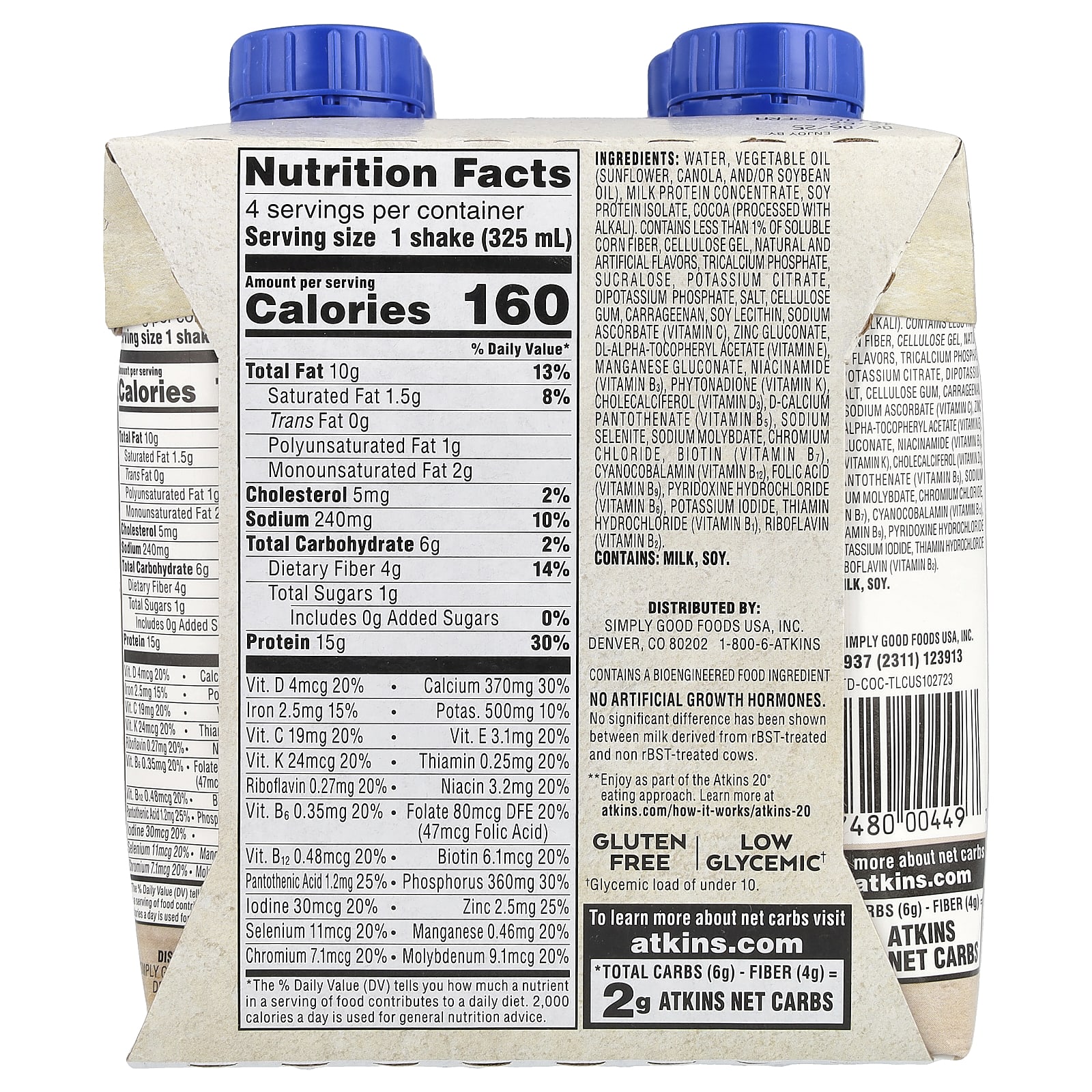 Вода, масло растительное подсолнечное, канолы, и / или соевое масло), концентрат молочного протеина, изолят соевого белка, какао (обработанное щелочью). содержит менее 1% растворимой кукурузной клетчатки, целлюлозный гель, натуральные и искусственные ароматизаторы, трикальцийфосфат, сукралоза, цитрат калия дикалий фосфат, соль, целлюлозная камедь, каррагинан, соевый лецитин, аскорбат натрия (витамин С), глюконат цинка, dl-альфа-токоферилацетат (витамин E), глюконат марганца, ниацинамид (витамин B3), фитонадион (витамин К), холекальциферол (витамин d3), d-пантотенат кальция (витамин B5), селенит натрия, молибдат натрия, хлорид хрома, биотин (витамин B7), цианокобаламин (витамин B12), фолиевая кислота (витамин B9), пиридоксина гидрохлорид (витамин B6), йодид калия, тиамина гидрохлорид (витамин B1), рибофлавин (витамин B2).