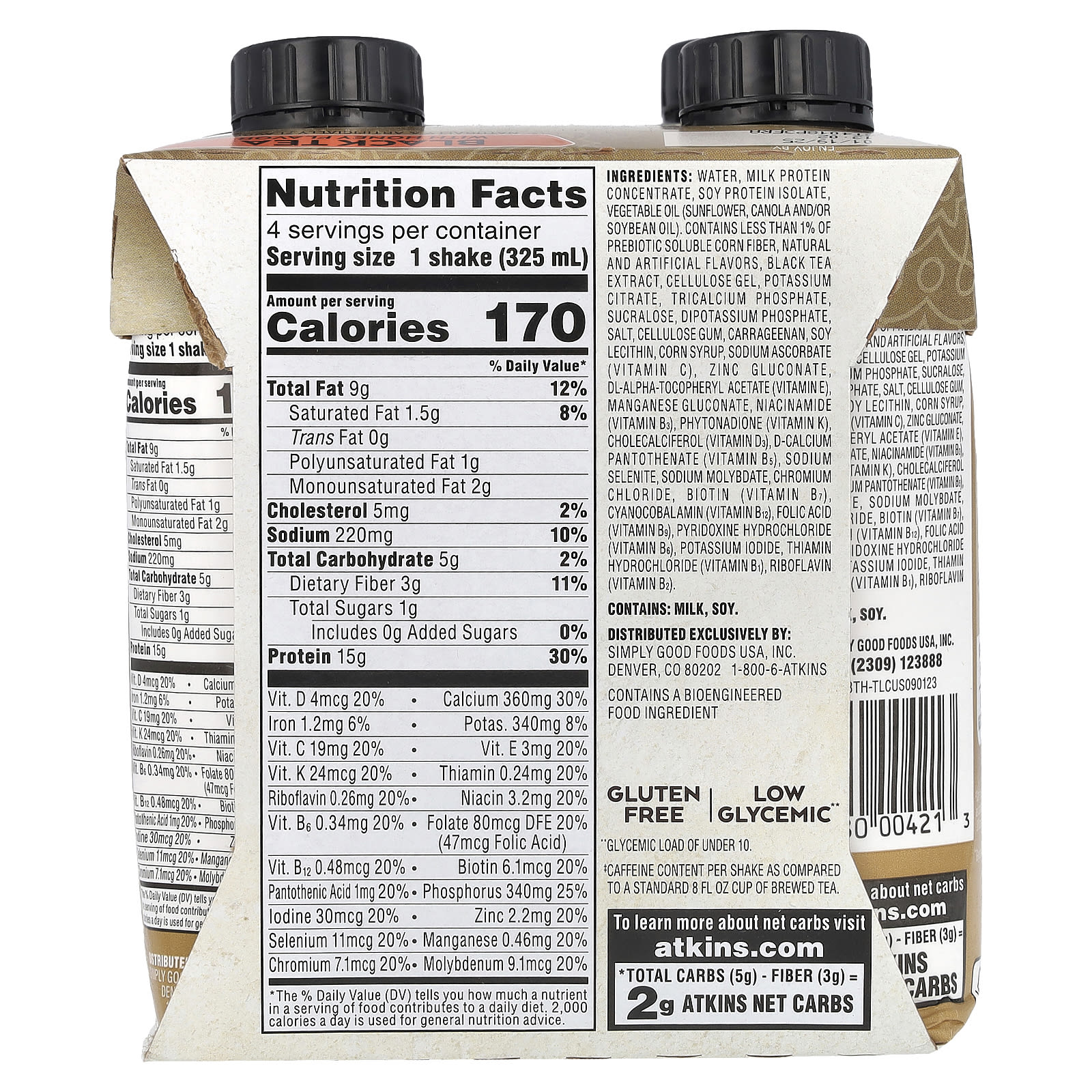 Вода, концентрат молочного протеина, изолят соевого белка, растительное масло (подсолнечное, рапсовое и/или соевое масло). содержит менее 1% пребиотической растворимой кукурузной клетчатки, натуральные и искусственные ароматизаторы, экстракт черного чая, целлюлозный гель, цитрат калия, трикальцийфосфат, сукралоза, дикалийфосфат, соль, целлюлозная камедь, каррагинан, соевый лецитин, кукурузный сироп, аскорбат натрия (витамин C), глюконат цинка, dl-альфа-токоферилацетат (витамин E), глюконат марганца, никотинамид (витамин B3), фитонадион (витамин K), холекальциферол (витамин D3), d-пантотенат кальция (витамин B5), селенит натрия, молибдат натрия, хлорид хрома, биотин (витамин B7), цианокобаламин (витамин B12), фолиевая кислота (витамин B9), пиридоксина гидрохлорид (витамин B6), йодид калия, тиамина гидрохлорид (витамин B1), рибофлавин (витамин B2).