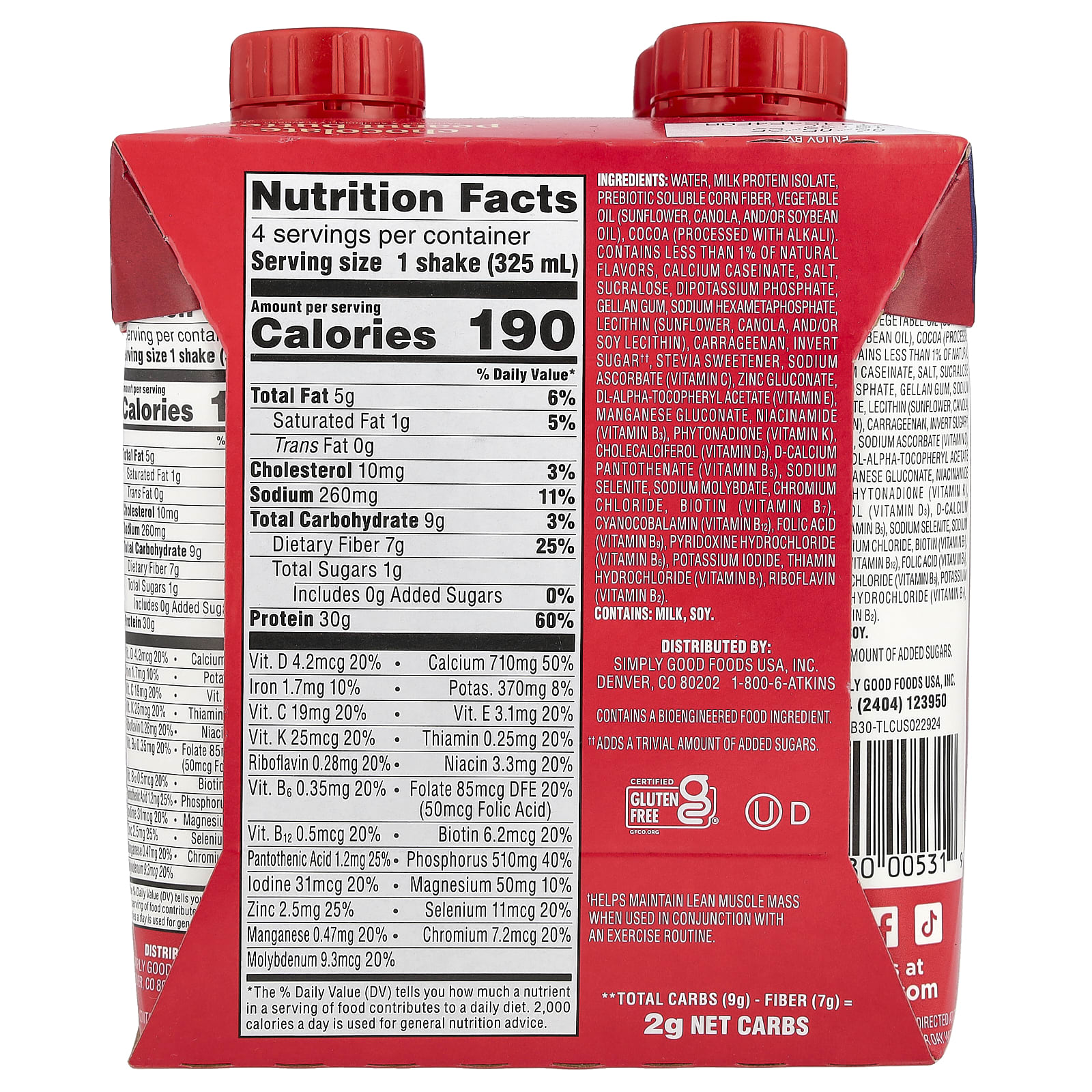 Вода, изолят молочного протеина, растворимая кукурузная клетчатка с пребиотиками, масло растительное (подсолнечное, канолы, и / или соевое масло), какао (обработанное щелочью), содержит менее 1% натуральных ароматизаторов, казеинат кальция, соль, сукралоза, дикалийфосфат, геллановая камедь, гексаметафосфат натрия, лецитин (из подсолнечника, канолы, сои), каррагинан, инвертный саха𠆆, подсластитель из стевии, аскорбат натрия (витамин С), глюконат цинка, dl-альфа-токоферилацетат (витамин E), глюконат марганца, ниацинамид (витамин B3), фитонадион (витамин К), холекальциферол (витамин d3), d-пантотенат кальция (витамин B5), селенит натрия, молибдат натрия, хлорид хрома, биотин (витамин B7), цианокобаламин (витамин B12), фолиевая кислота (витамин B9), пиридоксина гидрохлорид (витамин B6), йодид калия, тиамина гидрохлорид (витамин B1), рибофлавин (витамин B2).