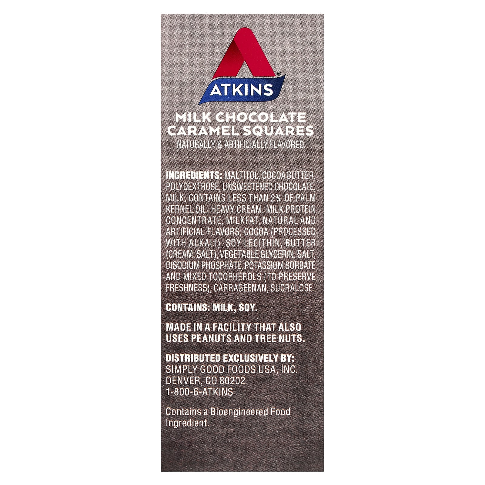 Мальтит, какао-масло, инулин, горький шоколад, молока, молочный жир, содержит менее 2% сливок, полидекстроза, концентрат молочного протеина, пальмоядровое масло, натуральные и искусственные ароматизаторы, лецитин из сои, какао (обработанное щелочью), соль, глицерин, динатрий фосфат, сорбат калия и смешанные токоферолы (для сохранения свежести), каррагинан, сукралоза.
