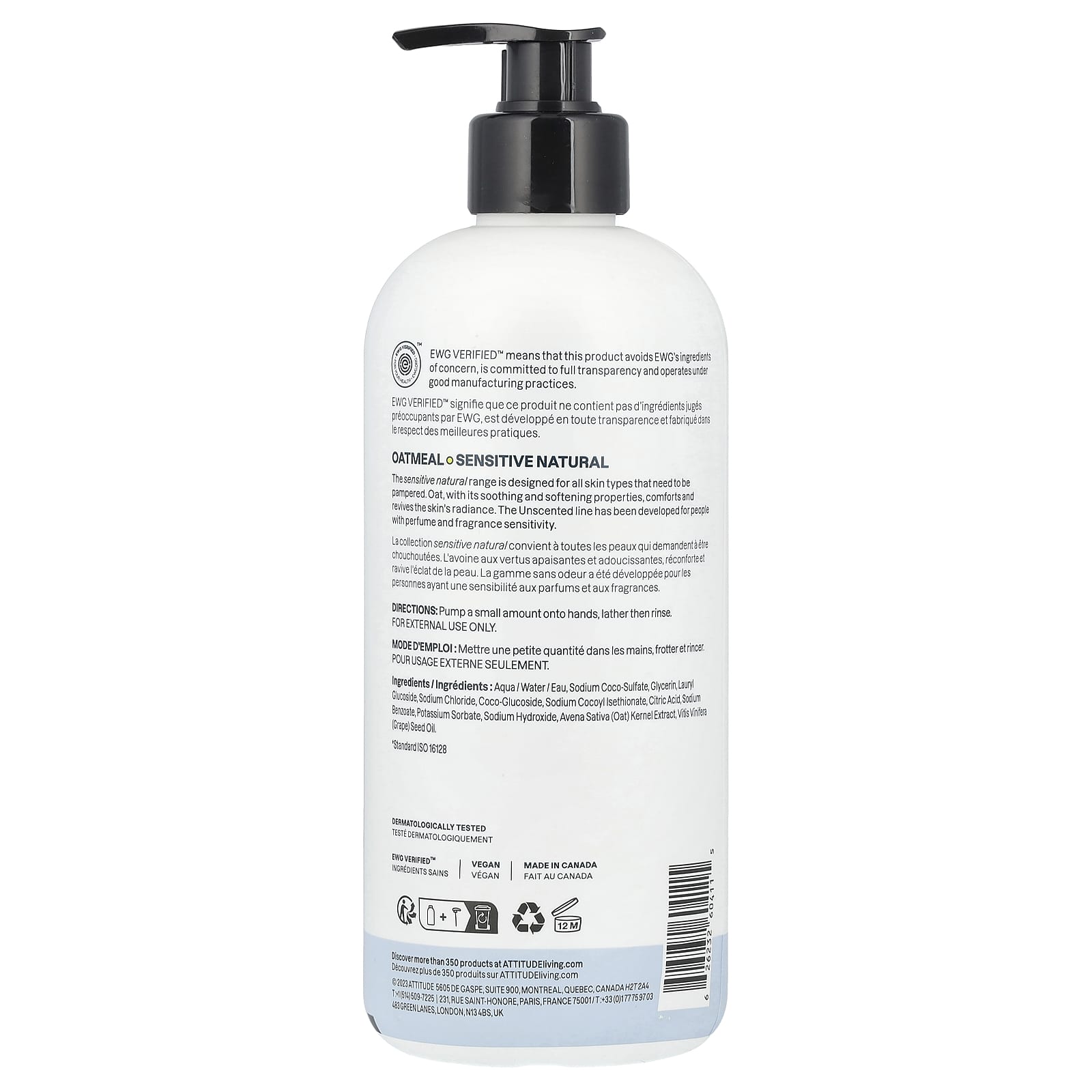 Вода, кокосульфат натрия, глицерин, лаурил глюкозид, хлорид натрия, кокоглюкозид, кокоил изетионат натрия, лимонная кислота, бензоат натрия, сорбат калия, гидроксид натрия, экстракт ядер овса (Avena sativa), масло виноградных косточек (vitis vinifera).