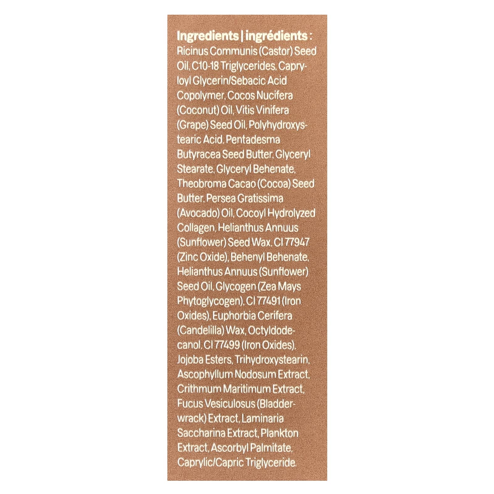 Касторовое масло (Ricinus communis), c10-18 триглицериды, каприлоил глицерин/сополимер себациновой кислоты, кокосовое масло (Cocos nucifera), масло из виноградных косточек (Vitis vinifera), полигидрокси стеариновая кислота. масло семян пентадесмы (Pentadesma Butyracea). глицерил стеарат, глицерил бегенат, масло зерен какао (Theobroma cacao). масло авокадо (Persea gratissima), кокоил гидролизованный коллаген, воск из семян подсолнечника (Helianthus annuus). оксид цинка (CI 77947), бегенил бегенат, подсолнечное масло (Helianthus annuus), гликоген (фитогликоген Zea mays), оксиды железа (CI 77491), канделильский воск (Euphorbia cerifera), октилдодеканол, оксиды железа (CI 77499). эфиры жожоба, тригидроксистеарин, экстракт аскофиллума (Ascophyllum nodosum), экстракт критмума (Crithmum maritimum), экстракт фукуса (Fucus vesiculosus), экстракт ламинарии сахаристой (Laminaria saccharina), экстракт планктона, аскорбил пальмитат каприловый/каприновый триглицерид.
