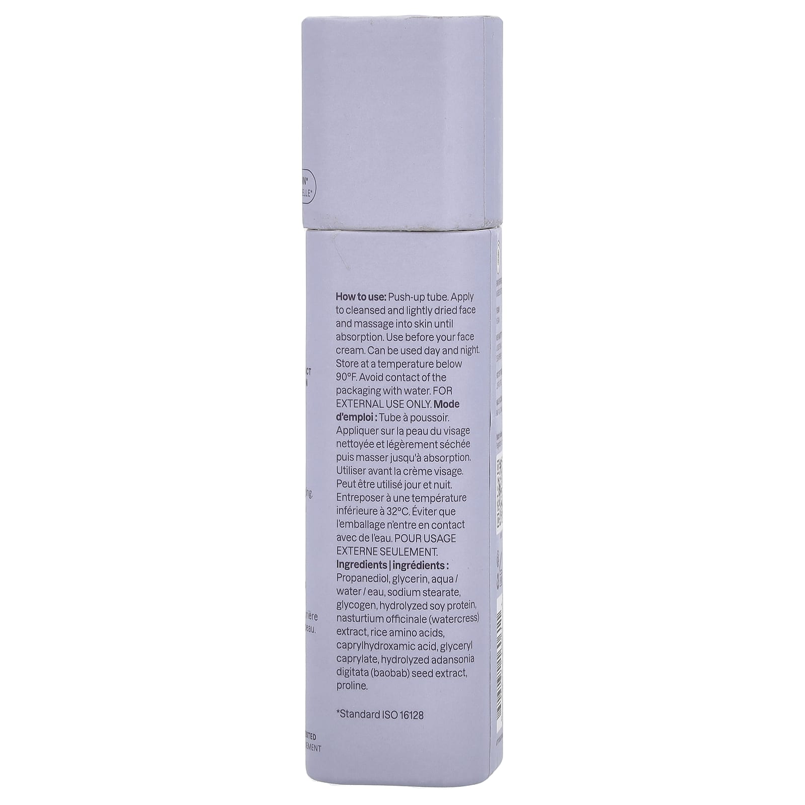 пропандиол, глицерин, вода, вода, вода, стеарат натрия, гликоген, гидролизованный белок из сои, экстракт настурции лекарственной (Nasturtium officinale), аминокислоты риса, каприлгидроксаминовая кислота, глицерил каприлат, гидролизованный экстракт семян баобаба (Adansonia digitata), пролин.