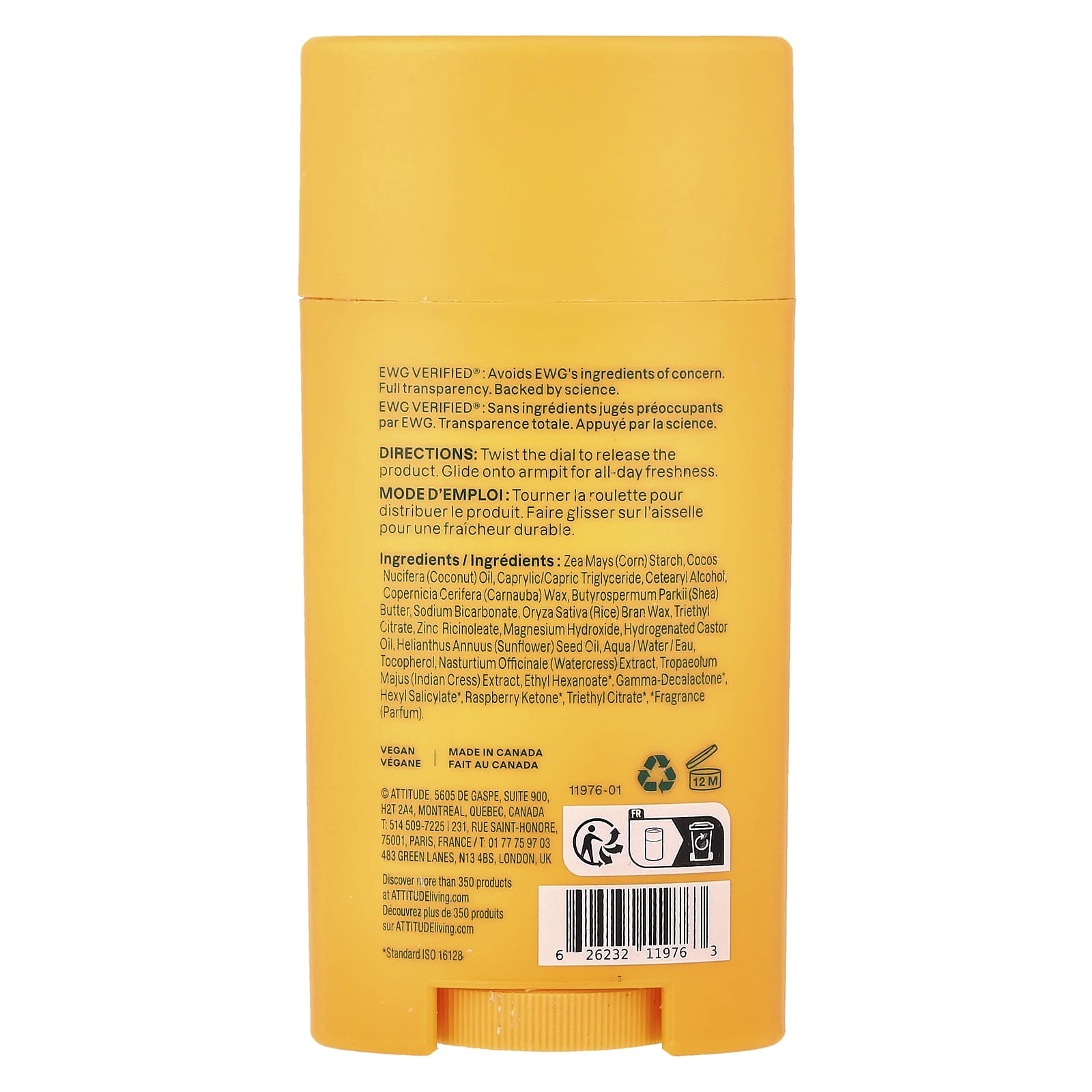 Кукурузный крахмал (Zea mays), кокосовое масло (Cocos nucifera), каприловый/каприновый триглицерид, цетеариловый спирт, карнаубский воск (Copernicia cerifera), масло ши (Butyrospermum parkii), бикарбонат натрия, воск из рисовых отрубей (Oryza sativa), триэтилцитрат, рицинолеат цинка, гидроксид магния, гидрогенизированное касторовое масло, подсолнечное масло (Helianthus annuus), вода, токоферол, экстракт жерухи (Nasturtium officinale), экстракт кресс-салата (Tropaeolum majus), этил гексаноат*, гамма-декалактон*, гексил салицилат*, малиновый кетон*, триэтилцитрат*, отдушка (парфюмерная композиция)*.