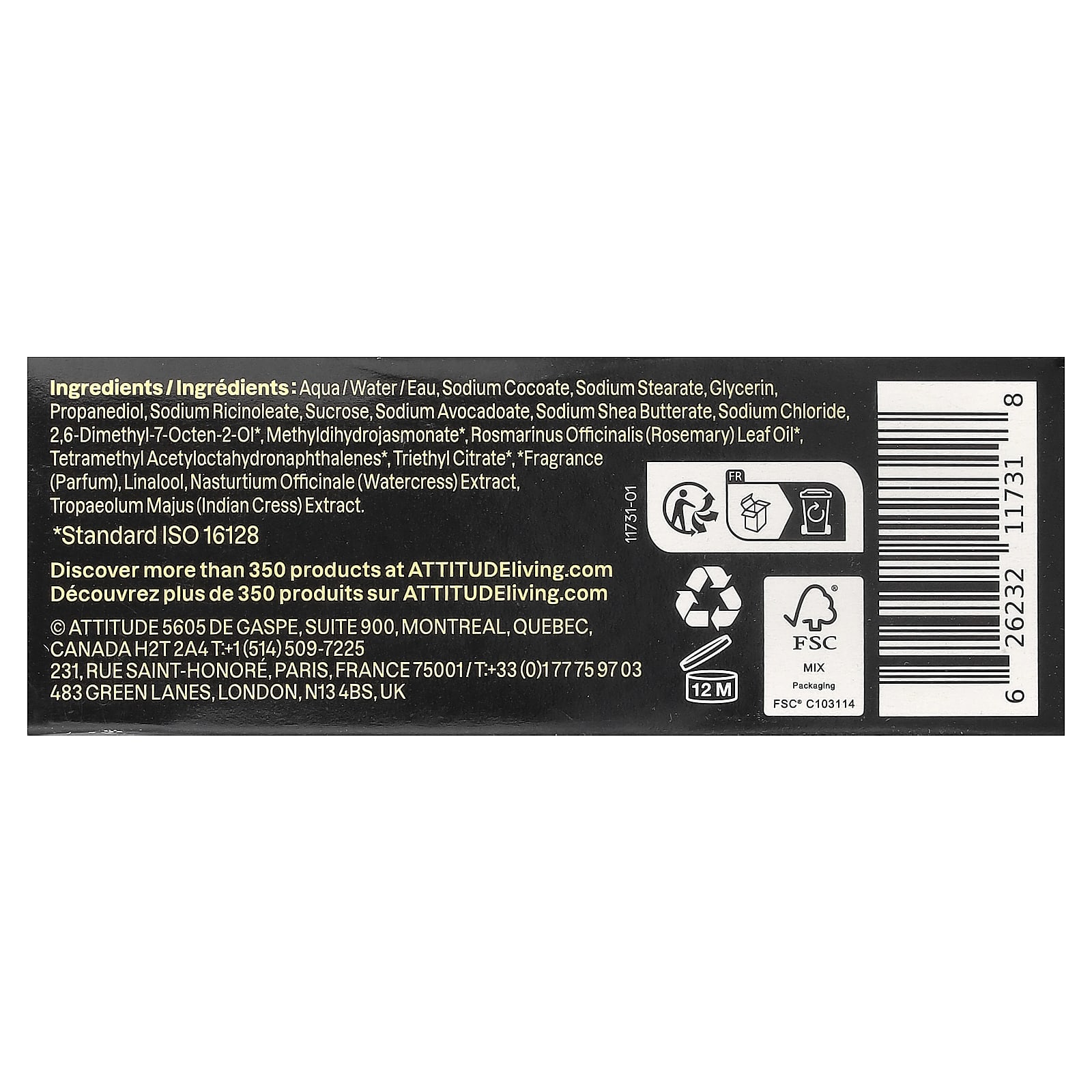 Вода (Aqua/eau), кокоат натрия, стеарат натрия, глицерин, пропандиол, рицинолеат натрия, сахароза, авокадоат натрия, масляный натрий ши, хлорид натрия, 2,6-диметил-7-октен-2-ол*, метил дигидрожасмонат*, масло из листьев розмарина (Rosmarinus officinalis)*, тетраметил ацетилоктагидронафталины*, триэтилцитрат*, * отдушка (парфюмерная композиция), линалоол, экстракт жерухи (Nasturtium officinale), экстракт кресс-салата (Tropaeolum majus).