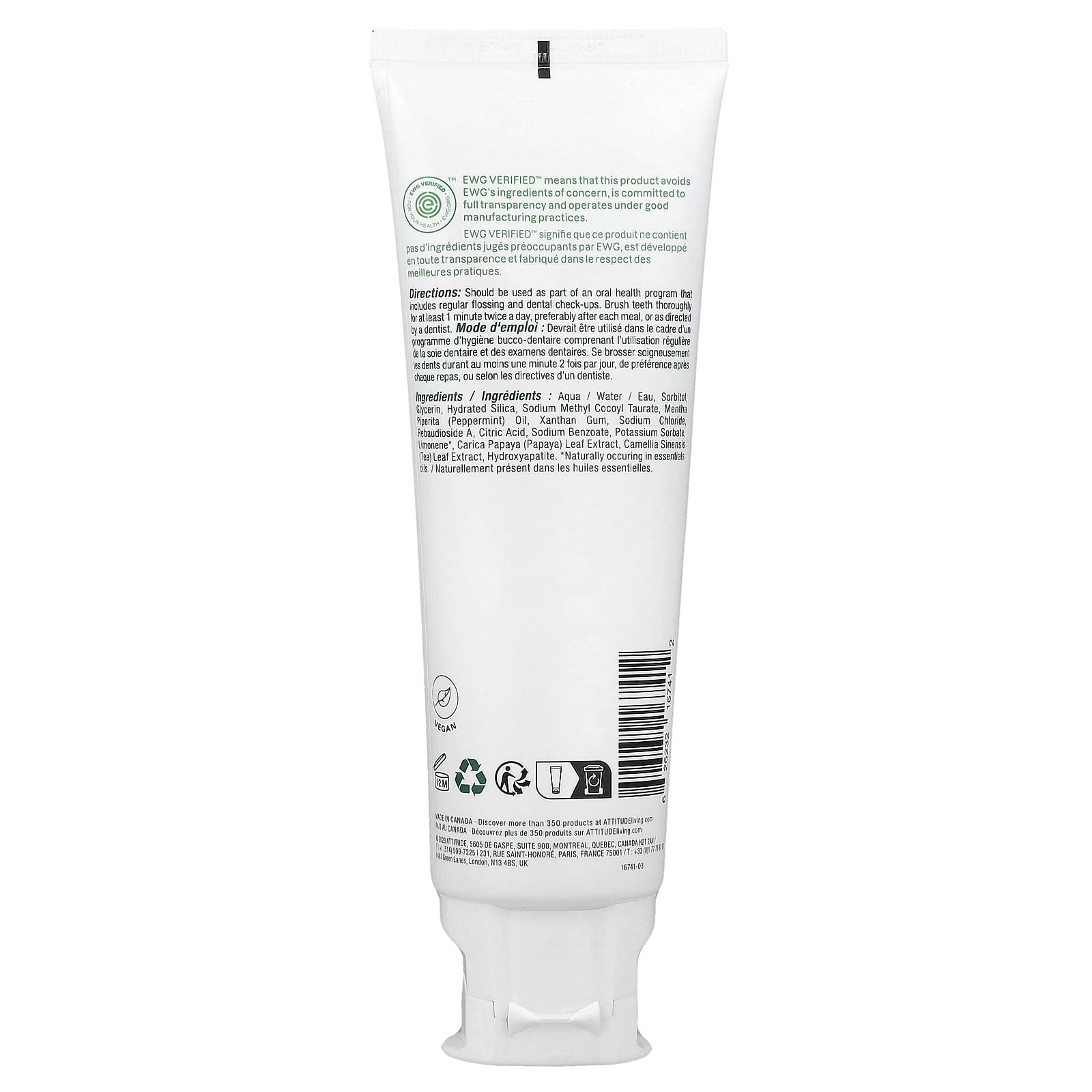 вода (Aqua), сорбитол, глицерин, гидратированный диоксид кремния, натрия метил кокоил таурат, масло перечной мяты (Mentha piperita), ксантановая камедь, хлорид натрия, ребаудиозид A, лимонная кислота, бензоат натрия, сорбат калия, лимонен*, экстракт листьев папайи (Carica papaya), экстракт листьев зелёного чая (Camellia sinensis), гидроксиапатит.
