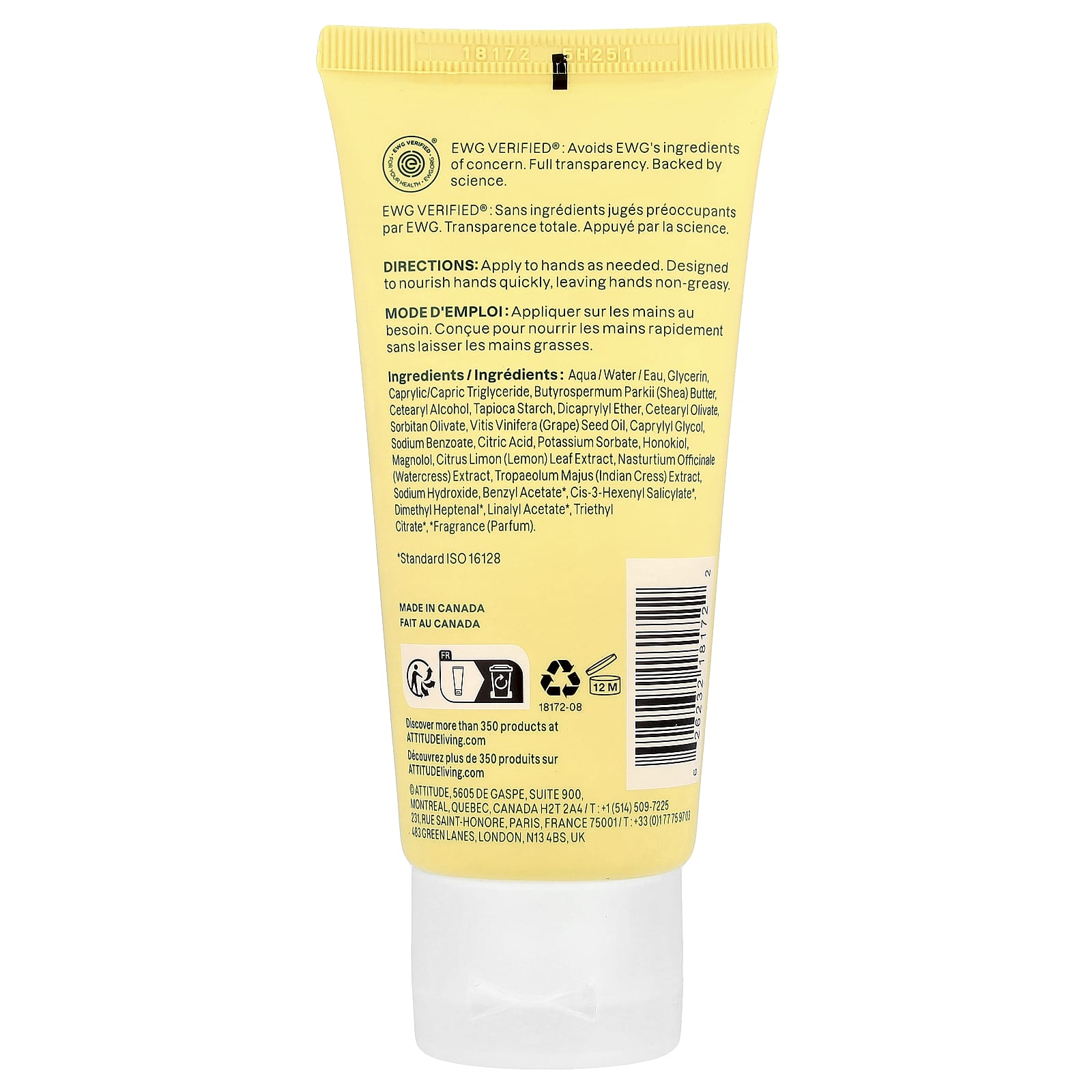 Вода (Aqua/eau), глицерин, каприловый/каприновый триглицерид, Масло Butyrospermum parkii (Ши), Цетеариловый спирт, крахмал тапиоки, дикаприлиловый эфир, цетеарилоливат, сорбитан оливат, масло из виноградных косточек (Vitis vinifera), каприлилгликоль, бензоат натрия, лимонная кислота, сорбат калия, хонокиол, магнолол, экстракт листьев лимона (Citrus limon), экстракт жерухи (Nasturtium officinale), экстракт кресс-салата (Tropaolummajus), гидроксид натрия, бензилацетат*, цис-3-гексенил салицилат*, диметил гептеналь*, линалилацетат*, триэтилцитрат*, * отдушка (парфюмерная композиция).