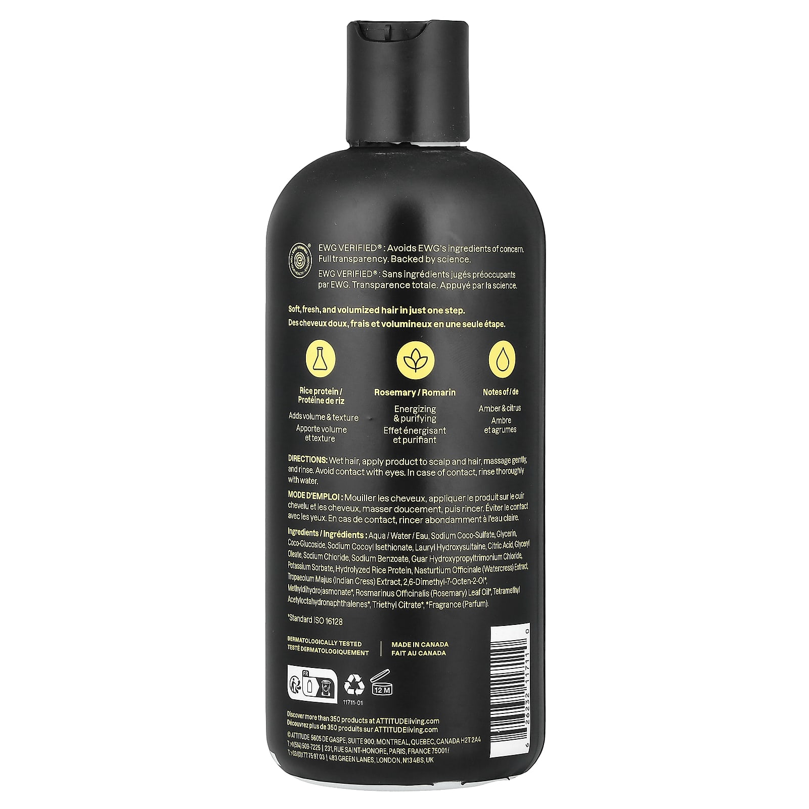 Вода, кокосульфат натрия, глицерин, кокоглюкозид, кокоил изетионат натрия, лаурил гидроксисултаин, лимонная кислота, глицерил олеат, хлорид натрия, бензоат натрия, гуар гидроксипропилтримония хлорид, сорбат калия, гидролизованный рисовый протеин, экстракт жерухи (Nasturtium officinale), экстракт кресс-салата (Tropaeolum majus), 2,6-диметил-7-октен-2-ол*, метил дигидрожасмонат*, масло из листьев розмарина (Rosmarinus officinalis)*, тетраметил ацетилоктагидронафталины*, триэтилцитрат*, отдушка (парфюмерная композиция)*.