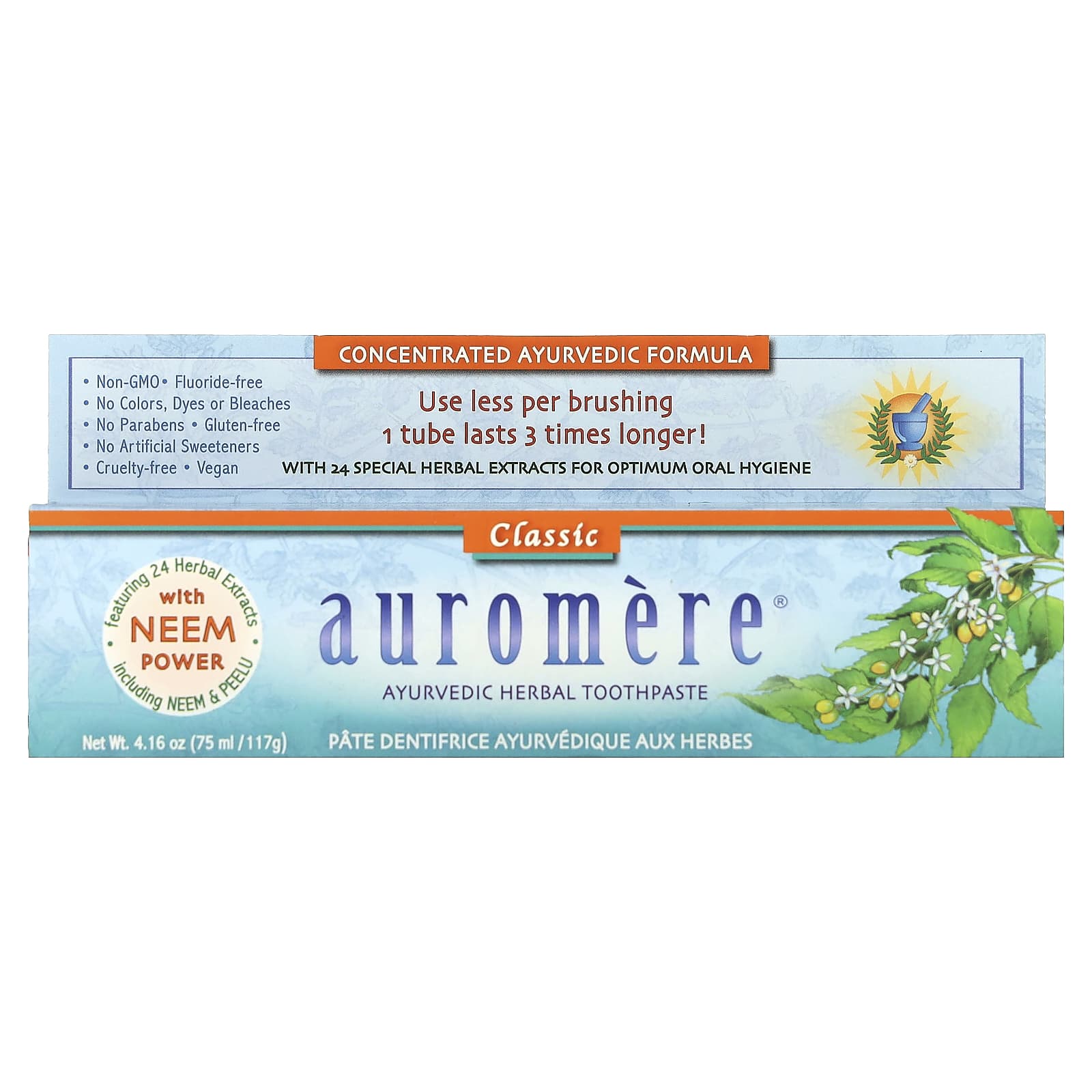 Аюрведическая рецептура от Auromere сочетает очищающие и энергетические свойства нима, пилу и экстракты еще 22 растений, полученные из коры, корня, цветов и растений целиком. Все эти растения в течение многих столетий ценились специалистами аюрведы за их эффективность для поддержания гигиены полости рта (как по отдельности, так и в сочетании друг с другом).
