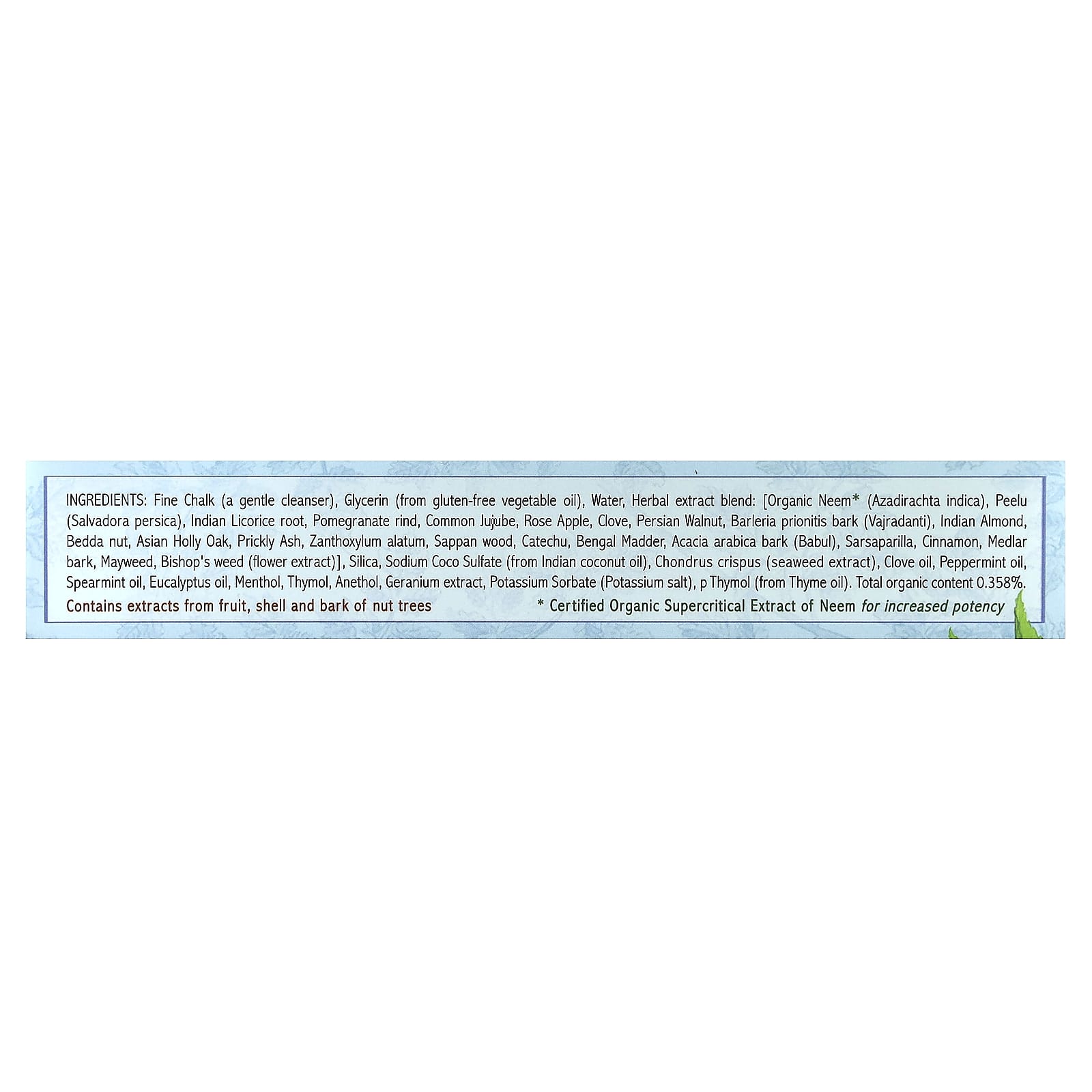 Мел высокого качества (мягкое очищающее средство), глицерин (из растительного масла без глютена), вода, смесь экстрактов трав: органический ним (Azadirachta indicia)*, пилу (Salvadora persica), корень индийской солодки, кожура граната, зизифус мавританский, джамбоза, гвоздика, Персидский грецкий орех, кора барлерии пильчатой (Barleria prionitis), индийский миндаль, бибхитаки, дуб каменный, сычуаньский перец, зантоксилум (Zanthoxylum alatum), цезальпиния саппан, акация катеху, марена бенгальская, кора акации нильской (Acacia arabica), сарсапарель, корица, кора мушмулы, пупавка собачья, горец многоцветковый (экстракт цветков)], диоксид кремния, кокосульфат натрия (из индийского кокосового масла), ирландский мох (Chondrus crispus) (экстракт морской водоросли), гвоздичное масло, масло перечной мяты, масло мяты колосистой, масло эвкалипта, ментол, тимол, анетол, экстракт герани, сорбат калия (калиевая соль), п-тимол (из масла чабреца). общее органическое содержание 0358%.