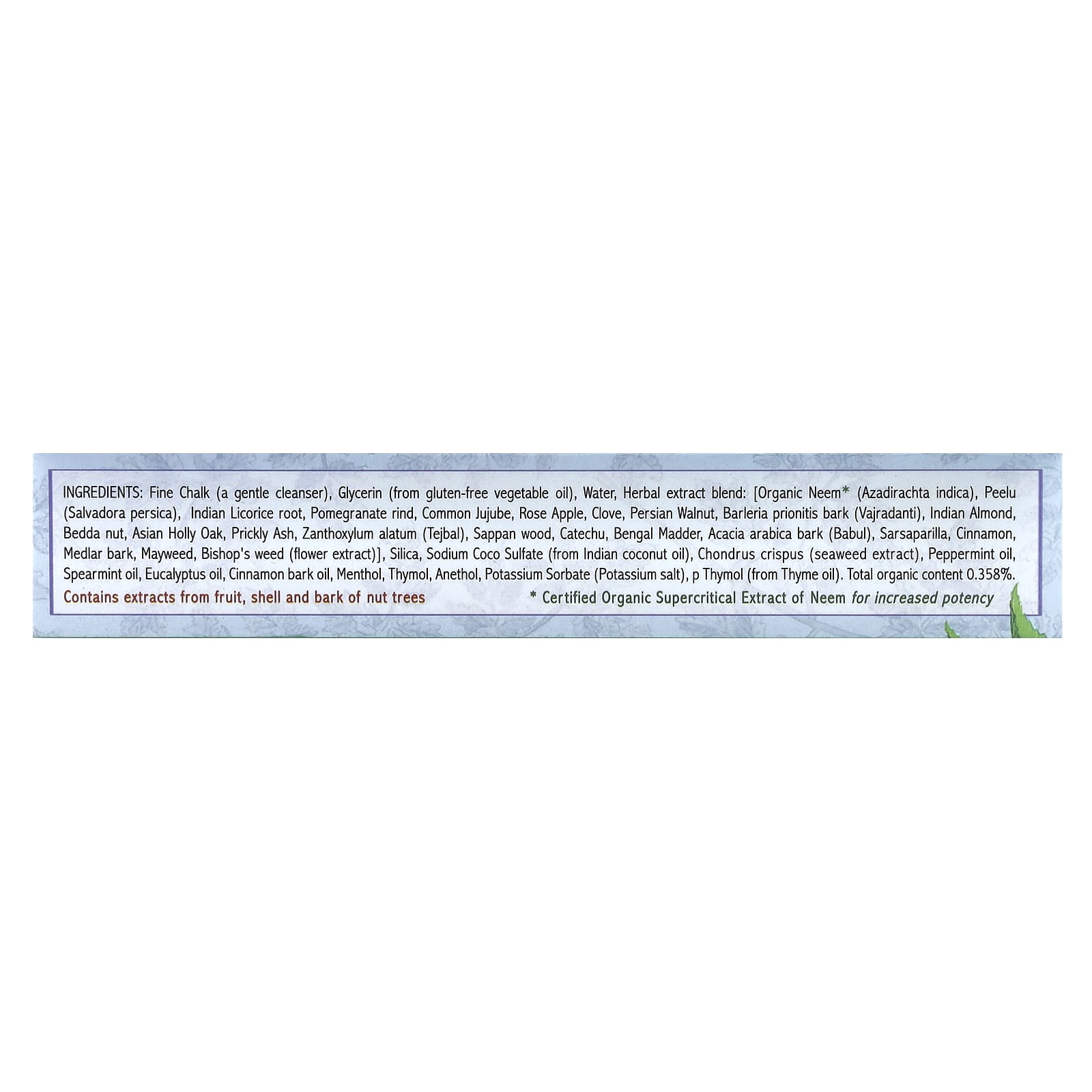 Мел высокого качества (мягкое очищающее средство), глицерин (из растительного масла без глютена), вода, смесь экстрактов трав: органический ним (Azadirachta indicia)*, пилу (Salvadora persica), корень индийской солодки, кожура граната, зизифус мавританский, джамбоза, гвоздика, грецкий орех, кора барлерии пильчатой (Barleria prionitis), индийский миндаль, бибхитаки, дуб каменный, сычуаньский перец, Zanthoxylum alatum (тейбал), цезальпиния саппан, акация катеху, марена бенгальская, кора акации нильской (Acacia arabica), сарсапарель, корица, кора мушмулы, пупавка собачья, епископа (flower extract), диоксид кремния, кокосульфат натрия (из индийского кокосового масла), ирландский мох (Chondrus crispus) (экстракт морской водоросли), масло перечной мяты, масло мяты кудрявой, масло эвкалипта, масло из коры коричного дерева, ментол, тимол, анетол, сорбат калия (калиевая соль), p-тимол (из масла чабреца).