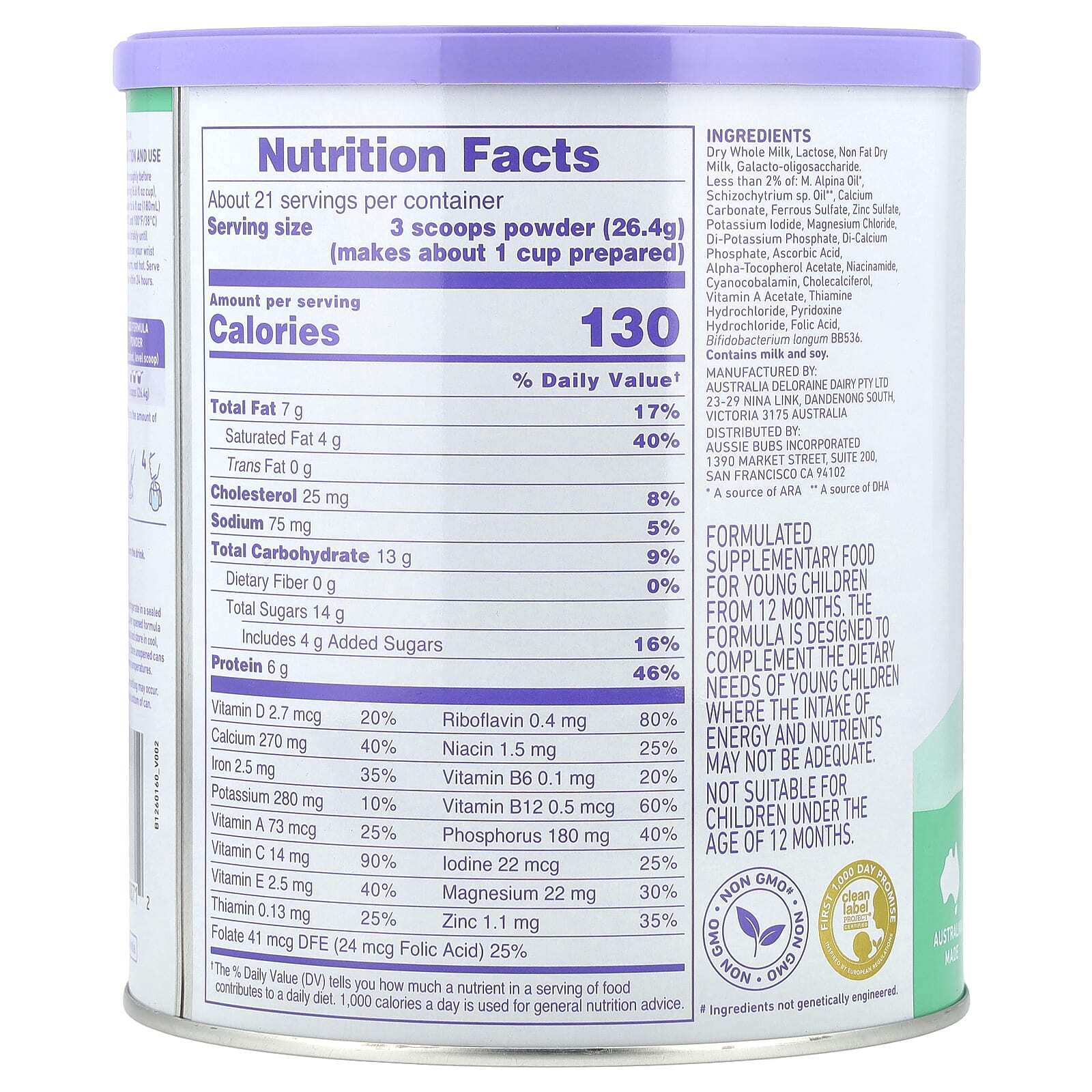 Сухое цельное молоко, лактоза, обезжиренное сухое молоко, галактоолигосахариды, менее 2%: m. альпиновое масло *, Schizochytrium sp. масло **, карбонат кальция, сульфат железа, сульфат цинка, йодид калия, хлорид магния, дикалийфосфат, дикальций фосфат, аскорбиновая кислота, альфа-токоферола ацетат, никотинамид, цианокобаламин, холекальциферол, ацетат витамина A, тиамина гидрохлорид, пиридоксина гидрохлорид, фолиевая кислота, бифидобактерии лонгум (bifidobacterium longum) bb536.