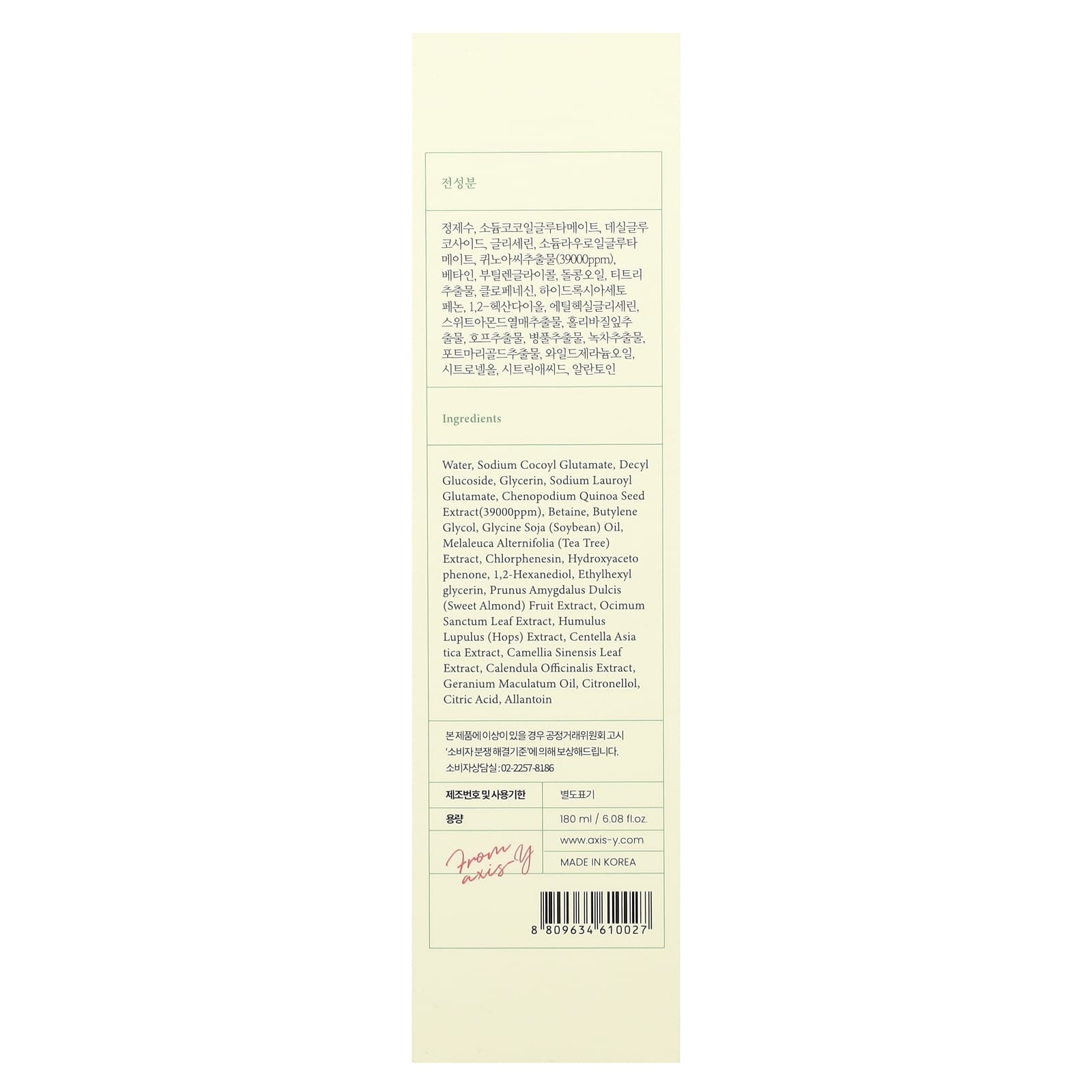 Вода, кокоил глутамат натрия, децил глюкозид, глицерин, натрия лауроил глутамат, экстракт киноа (Chenopodium quinoa) (39000 част./млн), бетаин, бутиленгликоль, соевое масло (Glycine soja), экстракт чайного дерева (Melaleuca alternifolia), хлорфенезин, гидроксиацетофенон, 1,2-гександиол, этилгексилглицерин, экстракт плодов сладкого миндаля (Prunus amygdalus dulcis), экстракт листьев туласи (Ocimum sanctum), экстракт хмеля (Humulus lupulus), экстракт готу колы (Centella asiatica), экстракт листьев зеленого чая (Camellia sinensis), экстракт календулы (Calendula officinalis), масло герани (Geranium maculatum), цитронеллола, лимонная кислота, аллантоин.