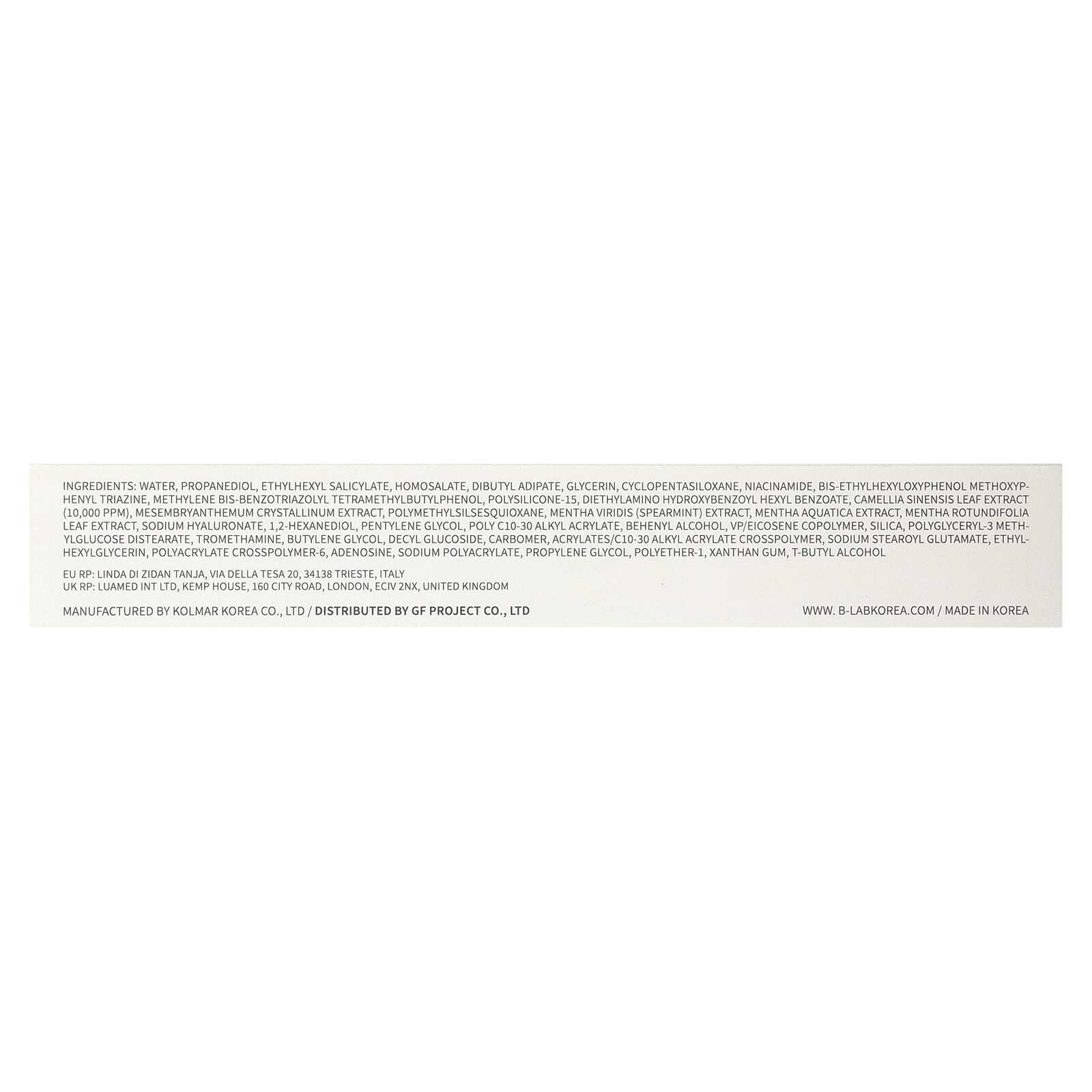 Вода, пропандиол, этилгексил салицилат, гомосалат, дибутиладипат, глицерин, циклопентасилоксан, никотинамид, бис-этилгексилоксифенол метоксифенил триазин, метилен бис-бензотриазолил тетраметилбутилфенол, полисиликон-15, диэтиламиногидроксибензоил гексил бензоат, экстракт листьев камелии китайской (10 000 част. / млн), экстракт хрустальной травы (Mesembryanthemum crystalinum), полиметилсилсесквиоксан, экстракт мяты колосистой (Mentha viridis), экстракт мяты водной, экстракт листьев мяты яблочной (Mentha rotundifolia), гиалуронат натрия, 1,2-гександиол, пентилен гликоль, поли c10-30 алкил акрилат, бегениловый спирт, винилпирролидон/эйкозен сополимер, диоксид кремния, полиглицерил-3 метилглюкозы дистеарат, трометамин, бутиленгликоль, децил глюкозид, карбомер, акрилат/c10-30 алкил акрилат кроссполимер, натрия стеароил глутамат, этилгексилглицерин, полиакрилата кроссполимер-6, аденозин, полиакрилат натрия, пропиленгликоль, полиэфир-1, ксантановая камедь, т-бутиловый спирт.