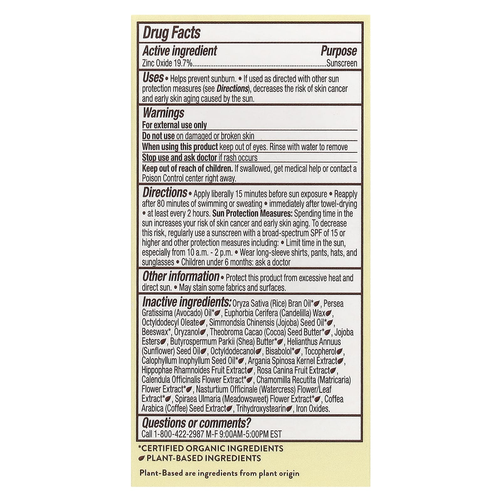 | Масло из рисовых отрубей (Oryza sativa)** Масло авокадо (Persea gratissima)**, канделильский воск (Euphorbia cerifera)•, октилдодецил олеат•, масло семян жожоба (Simmondsia chinensis)*, пчелиный воск*, оризанол•, какао (какао) ) масло из семян жожоба**, эфиры жожоба*, масло ши (Butyrospermum parkii)**, масло семян подсолнечника (Helianthus annuus)*, октилдодеканол•, бисаболол*•, токоферол•, масло семян калофиллума (Calophyllum inophyllum)*•, экстракт ядер арганы (Argania spinosa)• , экстракт плодов облепихи рамновидной (Hippophae rhamnoides)•, экстракт плодов шиповника (Rosa canina)•, экстракт цветков календулы (Calendula officinalis)*•, экстракт цветков ромашки лекарственной (Chamomilla recutita)•*, экстракт цветков и листьев жерухи (Nasturtium officinale)**, экстракт цветков таволги (Spiraea ulmaria)• *, экстракт зерен кофе арабики (Coffea arabica)•, тригидроксистеарин•, оксиды железа. * Сертифицированные органические ингредиенты • Ингредиенты растительного происхождения | |