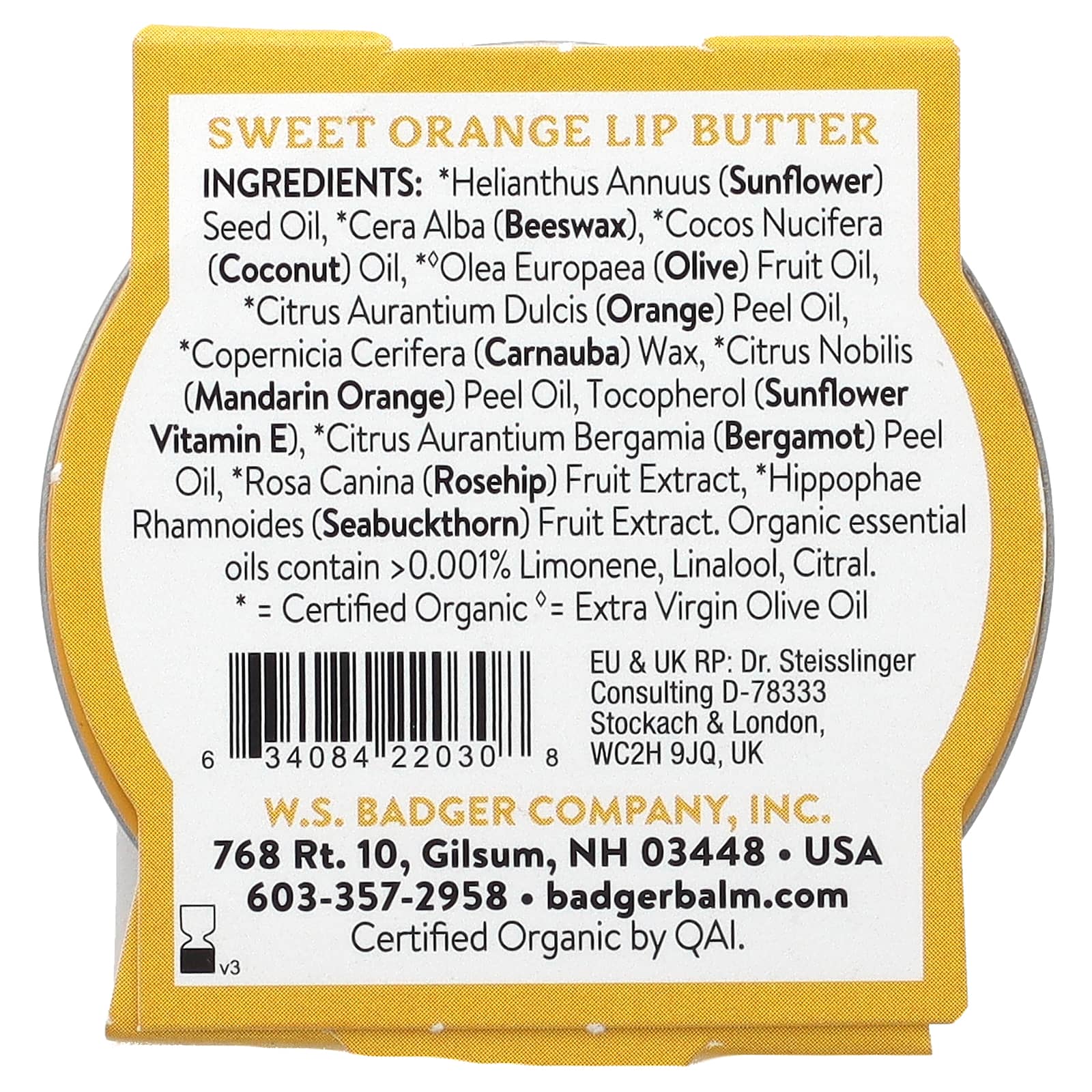 Подсолнечное масло (Helianthus annuus), пчелиный воск, кокосовое масло (Cocos nucifera)*, * Масло из плодов оливы (Olea europaea), масло из цедры апельсина (Citrus aurantium dulcis)*, воск карнаубский (Copernicia cerifera), масло из цедры мандарина (Citrus nobilis)*, токоферол (витамин Е из подсолнечника), масло из цедры плодов бергамота (Aurantium bergamia), экстракт плодов шиповника (Rosa canina)*, экстракт плодов облепихи (Hippophae rhamnoides). Органические эфирные масла содержат & amp; gt; 0,001% лимонена, линалоол, цитраль.