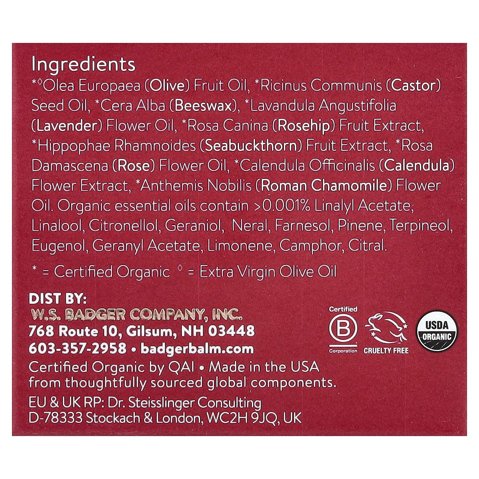 Оливковое масло (Olea europaea)*♢, касторовое масло (Ricinus communis)*, пчелиный воск (Cera alba)*, масло из цветков лаванды (Lavandula angustifolia)*, экстракт плодов шиповника (Rosa canina)*, экстракт плодов облепихи (Hippophae rhamnoides)*, масло из цветков дамасской розы (Rosa damascena)*, экстракт цветков календулы (Calendula officinalis)*, масло из цветков ромашки римской (Anthemis nobilis)*. органические эфирные масла содержат > 0,001% линалилацетата, линалоол, цитронеллола, гераниола, нервной, фарнезол, пинен, терпинеол, эвгенол, геранил ацетат, лимонен, камфора, цитраль.