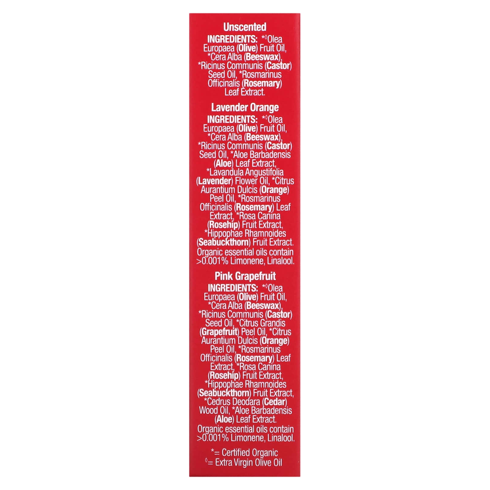 Розовый грейпфрут: оливковое масло (Olea europaea)*, пчелиный воск (Cera alba)*, касторовое масло (Ricinus communis)*, масло из цедры грейпфрута (Citrus grandis)*, масло из цедры апельсина (Citrus aurantium dulcis)*, экстракт листьев розмарина (Rosmarinus officinalis)*, экстракт плодов шиповника (Rosa canina)*, экстракт плодов облепихи (Hippophae rhamnoides)*, масло из древесины кедра (Cedrus deodara)*, экстракт листьев алоэ вера (Aloe barbadensis)*.