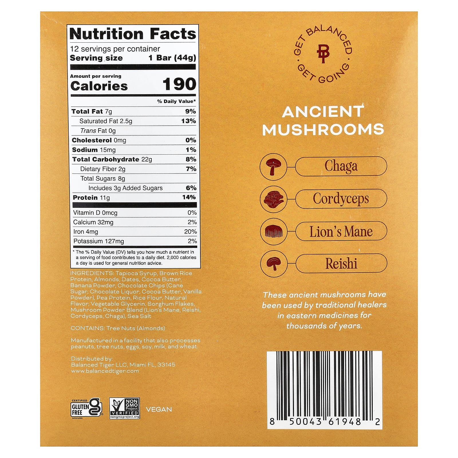 Тапиоковый сироп, протеин из коричневого риса, миндаль, финики, какао-масло, банановый порошок, шоколадная крошка (тростниковый сахар, тертое какао, какао-масло, ванильный порошок), гороховый протеин, рисовая мука, натуральный ароматизатор, растительный глицерин, хлопья сорго, порошковая смесь грибов (ежовик гребенчатый, рейши, кордицепс, чага), морская соль.