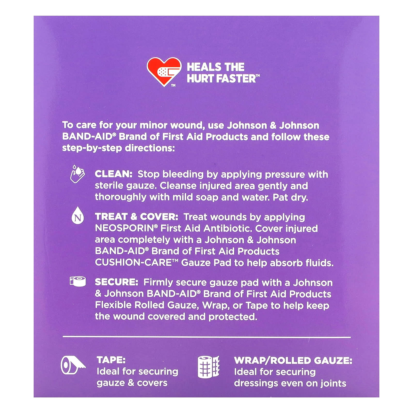Безопасность. Надежно закрепите марлевую повязку с помощью гибкой салфетки, бинта или салфетки бренда продуктов для первой помощи BAND-AID® Johnson & Johnson, чтобы защитить рану.