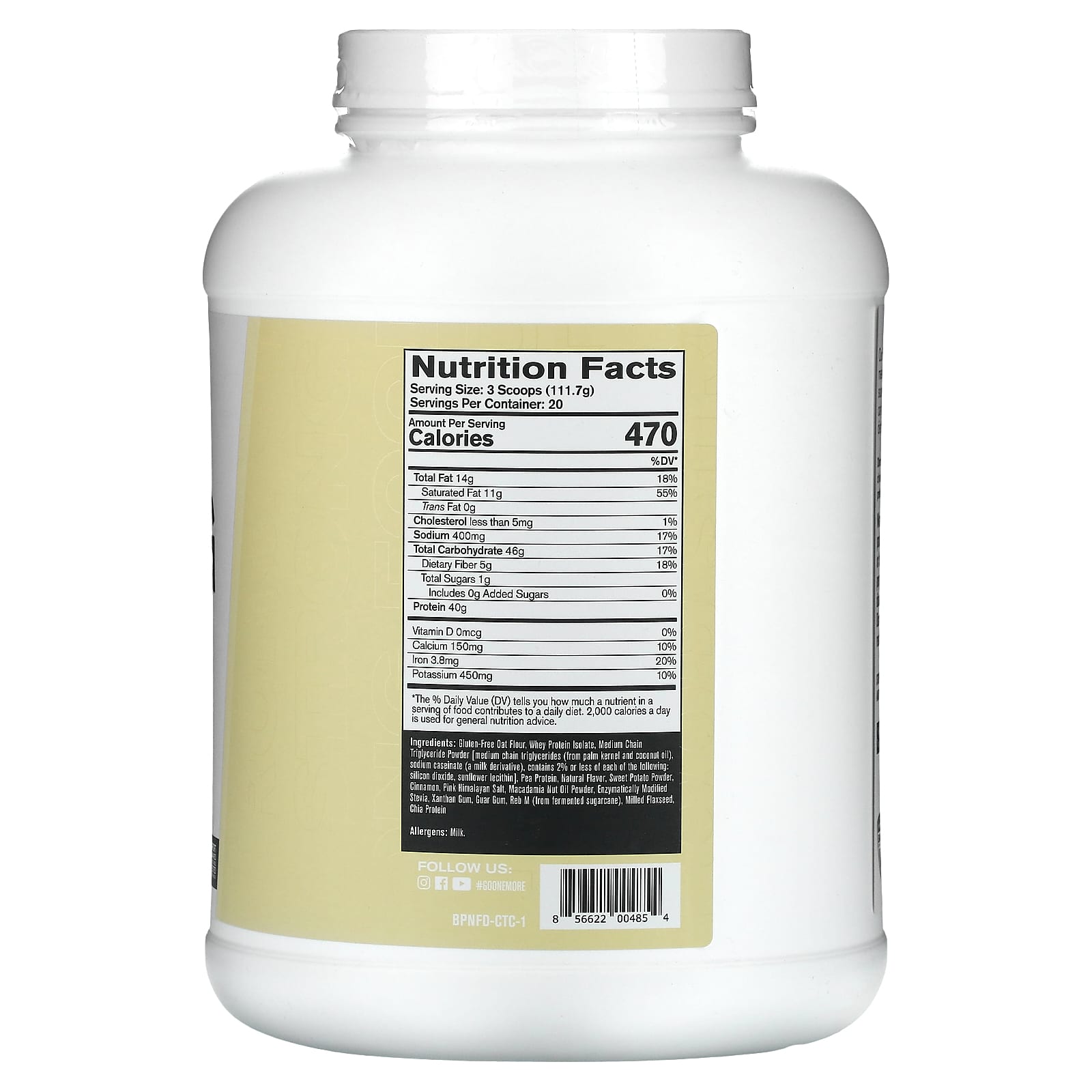 Овсяная мука без глютена, изолят сывороточного протеина, порошок среднецепочечных триглицеридов [среднецепочечные триглицериды (из ядер пальмы и кокосового масла), казеинат натрия (производное от молока), содержит не более 2% каждого из следующих веществ: диоксид кремния, лецитин подсолнечника), гороховый протеин, натурального ароматизатора, порошок из батата, корица, розовая гималайская соль, порошок из масла ореха макадамии, ферментативно модифицированная стевия, ксантановая камедь, гуаровая камедь, реб м (из ферментированного сахарного тростника), молотое льняное семя, белок чиа.