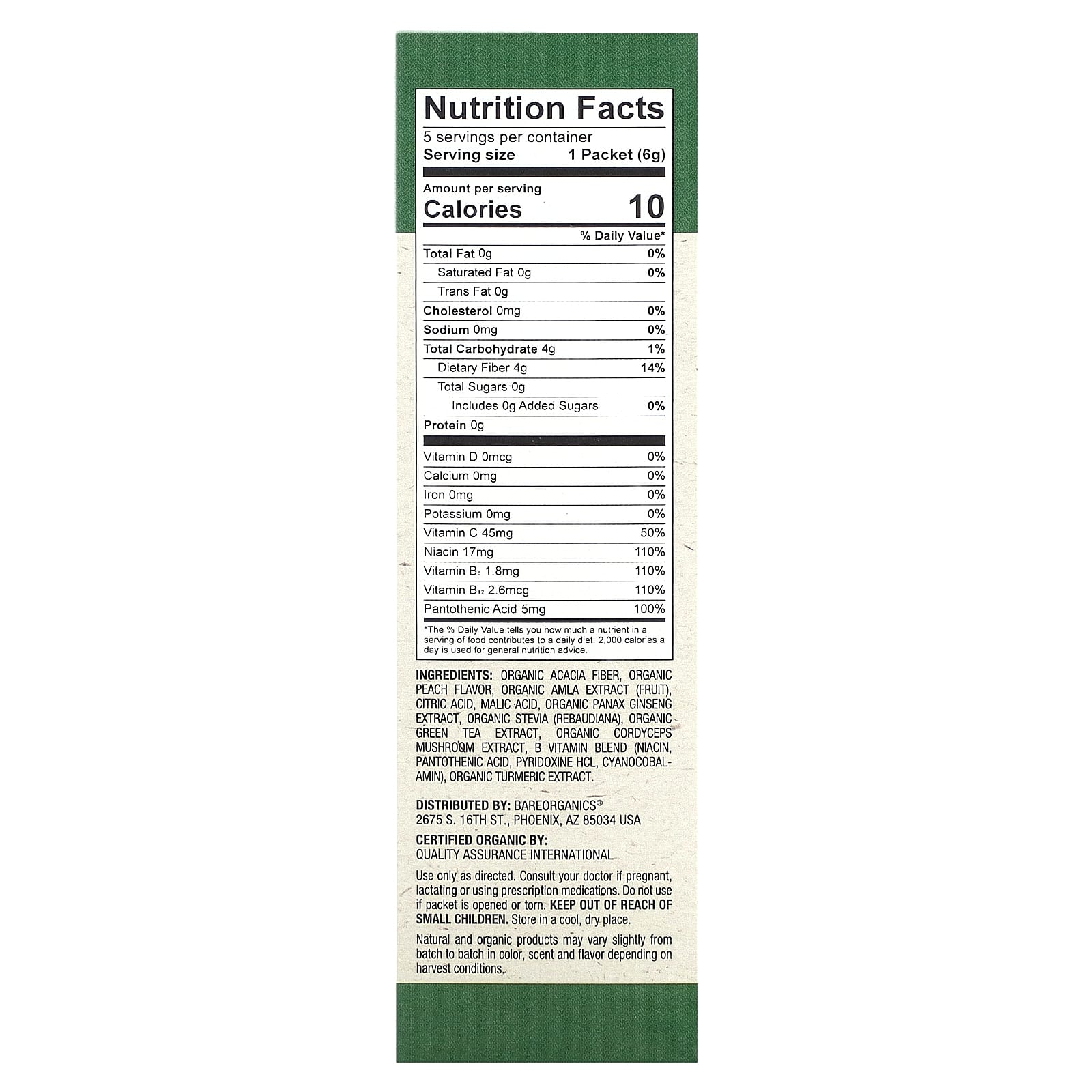 Органическое волокно акации, ароматизатор (органический персик), органический экстракт амлы (плоды), лимонная кислота, яблочная кислота, органический экстракт женьшеня, органическая стевия (ребаудиана), органический экстракт зеленого чая, экстракт органического гриба кордицепс, смесь витаминов группы B (ниацин, пантотеновая кислота, пиридоксина гидрохлорид, цианокобаламин), органический экстракт куркумы.