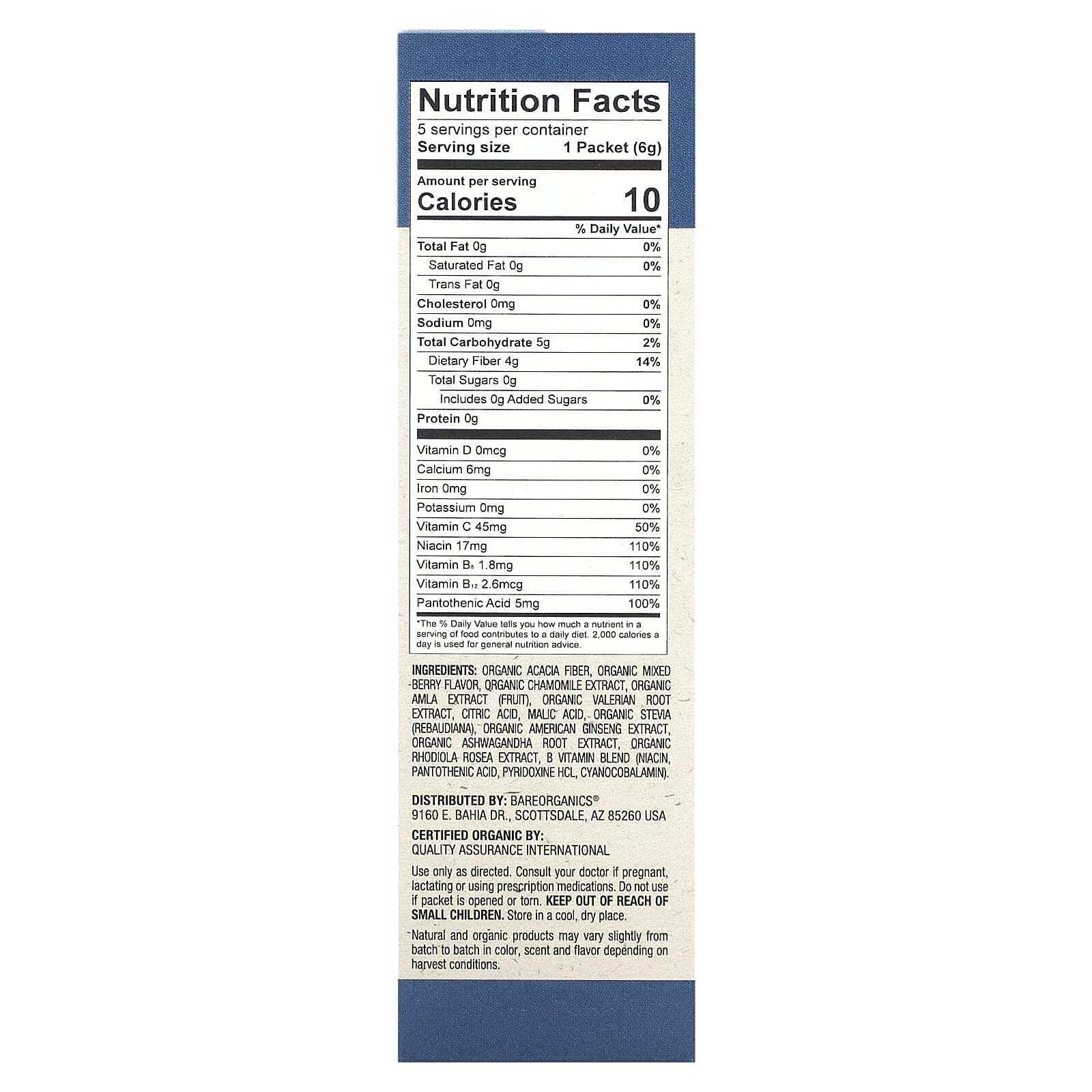 Органическое волокно акации, натуральный ароматизатор «Ягодное ассорти», органический экстракт ромашки, органический экстракт амлы (плод), органический экстракт корня валерианы, лимонная кислота, яблочная кислота, органическая стевия (ребаудиана), органический экстракт американского женьшеня, органический экстракт корня ашваганды, органический экстракт родиолы розовой, смесь витаминов группы B (ниацин, пантотеновая кислота, пиридоксина гидрохлорид, цианокобаламин).