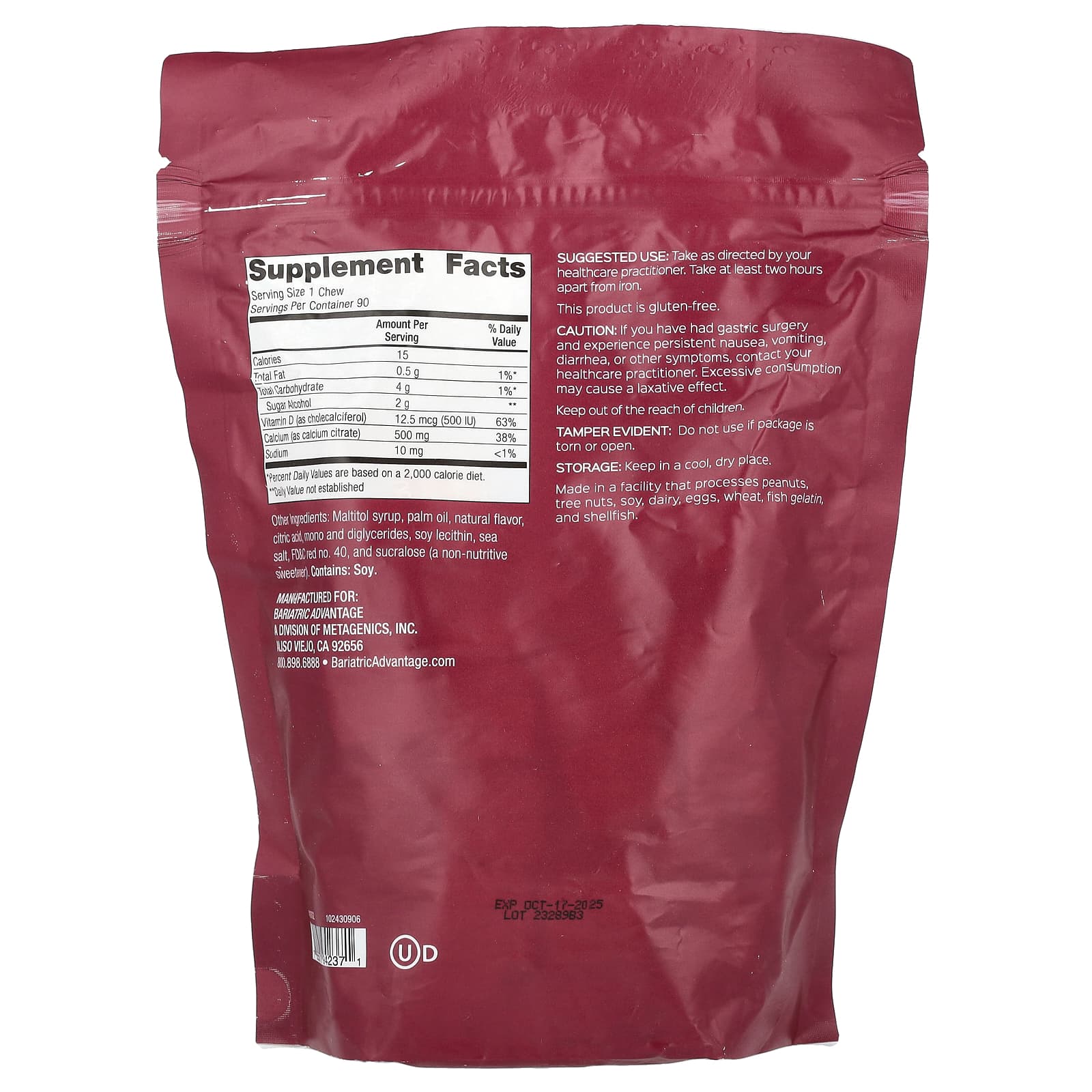 Bariatric Advantage Calcium Citrate Chewy Bite 500 мг специально разработан для бариатрических пациентов, содержит 500 мг кальция только из цитрата кальция и содержит 500 МЕ витамина D3 для поддержки усвоения кальция.