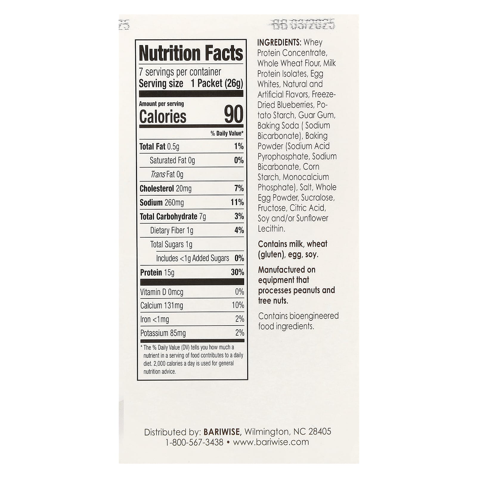 Концентрат сывороточного протеина, цельнозерновая пшеничная мука, изоляты молочного белка, яичный белок, натуральные и искусственные ароматизаторы, сублимированная голубика, картофельный крахмал, гуаровая камедь, пищевая сода (бикарбонат натрия), разрыхлитель (пирофосфорнокислый натрий, бикарбонат натрия, кукурузный крахмал, монокальцийфосфат), соль, порошок из цельных яиц, сукралоза, фруктоза, лимонная кислота, лецитин сои и/или подсолнечника.