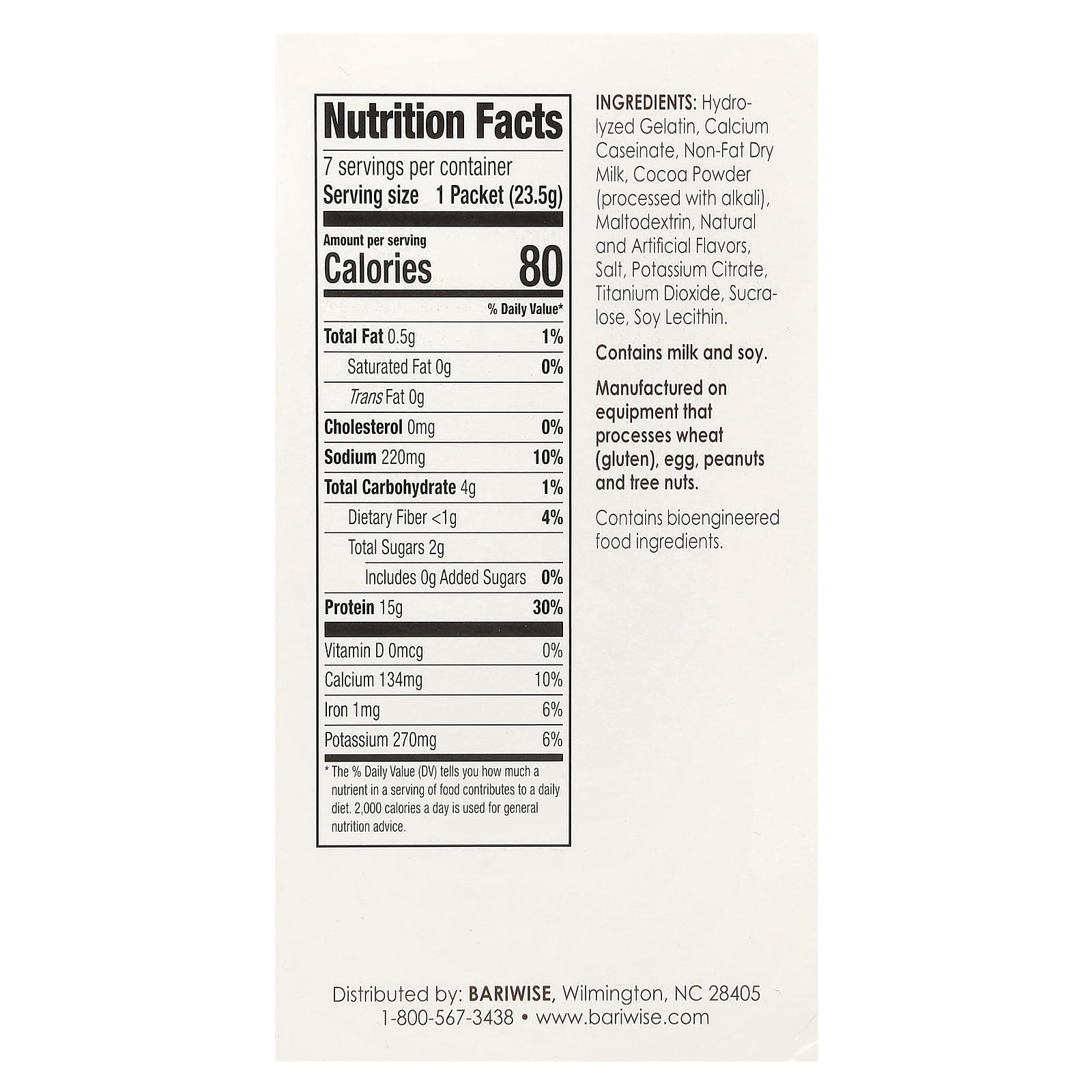 Гидролизованный желатин, казеинат кальция, обезжиренное сухое молоко, какао-порошок (обработанный щелочью), мальтодекстрин, натуральные и искусственные ароматизаторы, соль, цитрат калия, диоксид титана, сукралоза, лецитин из сои.