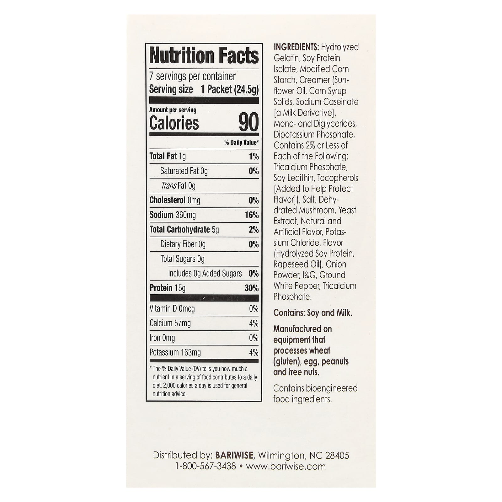 Гидролизованный желатин, изолят соевого белка, модифицированный кукурузный крахмал, сливки (подсолнечное масло, сухая кукурузная патока, казеинат натрия [производное от молока], моно- и диглицериды, дикалийфосфат, содержит не более 2% следующих ингредиентов: трикальций фосфат, соевый лецитин, токоферолы [добавлены для сохранения аромата]), соль, обезвоженные грибы, экстракт дрожжей, натуральные и искусственные ароматизаторы, хлорид калия, ароматизатор (гидролизованный соевый белок, рапсовое масло), луковый порошок, i&g, молотый белый перец, трикальцийфосфат.