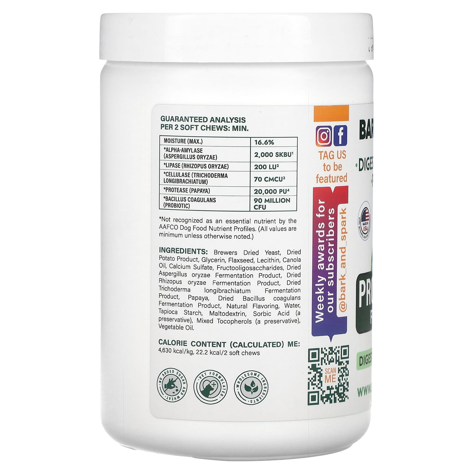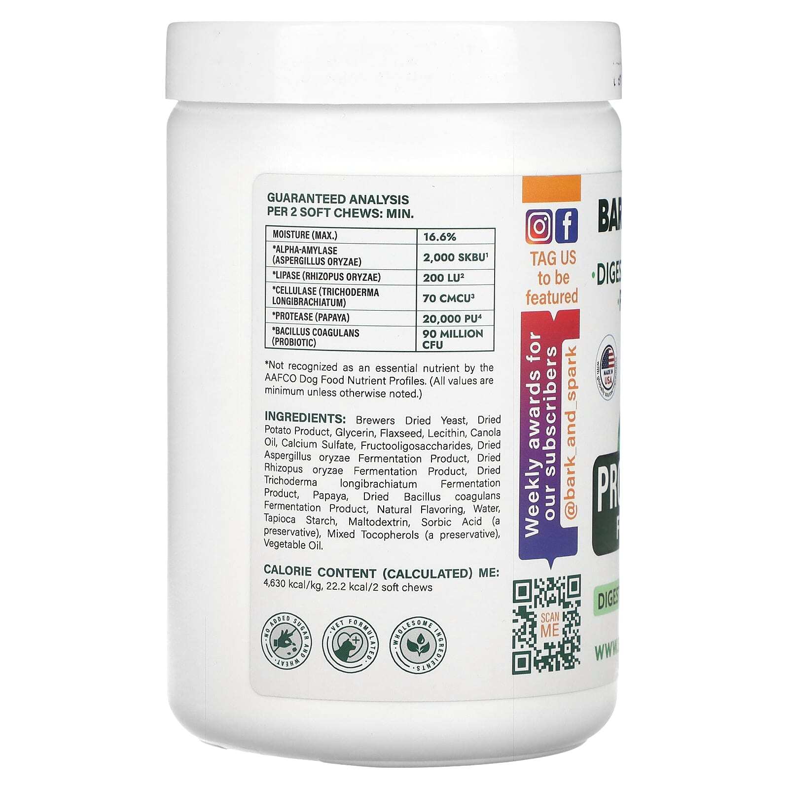 сухие пивные дрожжи, продукт из сухого картофеля, глицерин, льняное семя, лецитин, рапсовое масло, сульфат кальция, фруктоолигосахариды, сухой продукт ферментации аспергилла (Aspergillus oryzae), сухой продукт ферментации ризопуса (Rhizopus oryzae), сухой продукт ферментации триходермы (Trichoderma longibrachiatum), папайя, сухой продукт ферментации бактерий бациллус коагуланс (Bacillus coagulans), натуральный ароматизатор, вода, тапиоковый крахмал, мальтодекстрин, сорбиновая кислота (консервант), смешанные токоферолы (консервант), растительное масло.