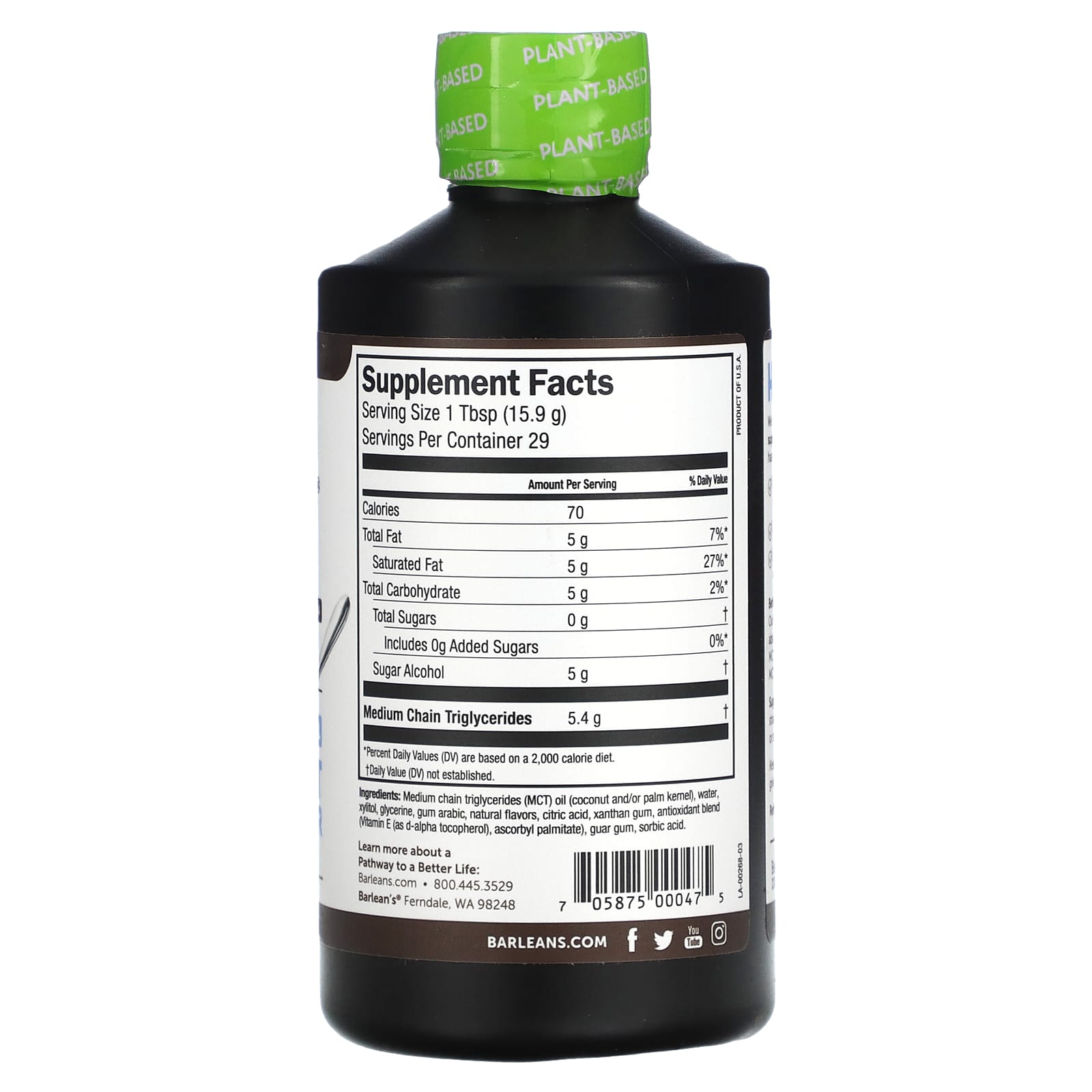 Среднецепочечные триглицериды (МСТ), масло (кокос и / или пальмоядровое масло), вода, ксилитол, глицерин, аравийская камедь, натуральный ароматизатор, лимонная кислота, ксантановая камедь, смесь антиоксидантов (витамин Е (в виде d-альфа-токоферола), аскорбил пальмитат), гуаровая камедь, сорбиновая кислота.