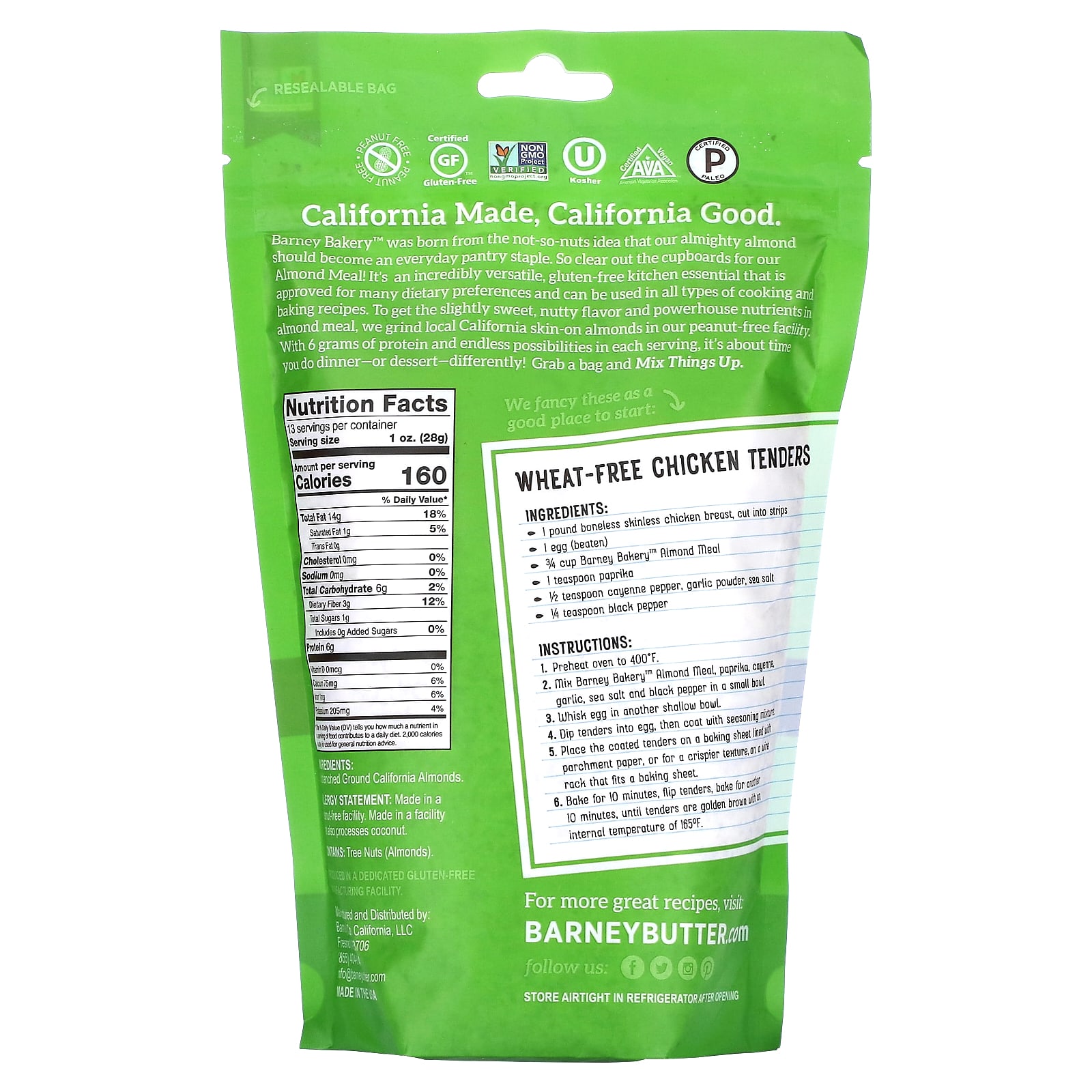 Компания Barney Bakery™ была создана на основе не очень ореховой мысли о том, что наш всемогущий миндаль должен стать ежедневным продуктом питания. Очистите буфет перед нашей миндальной едой! Это невероятно универсальный ингредиент, который не содержит глютена и является незаменимым ингредиентом на кухне. Он подходит для многих диетических рецептов и может использоваться во всех типах рецептов приготовления пищи и выпечки. Чтобы придать миндальной муке слегка сладковатый ореховый вкус и мощные питательные вещества, мы измельчаем местный калифорнийский миндаль с кожурой на нашем предприятии, где не обрабатывается арахис. 6 грамм протеина и его безграничные возможности в каждой порции — пора приготовить обед или десерт по-новому! Хватайте сумку и перемешивайте.