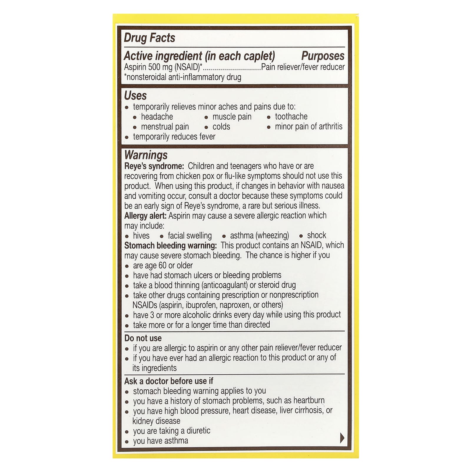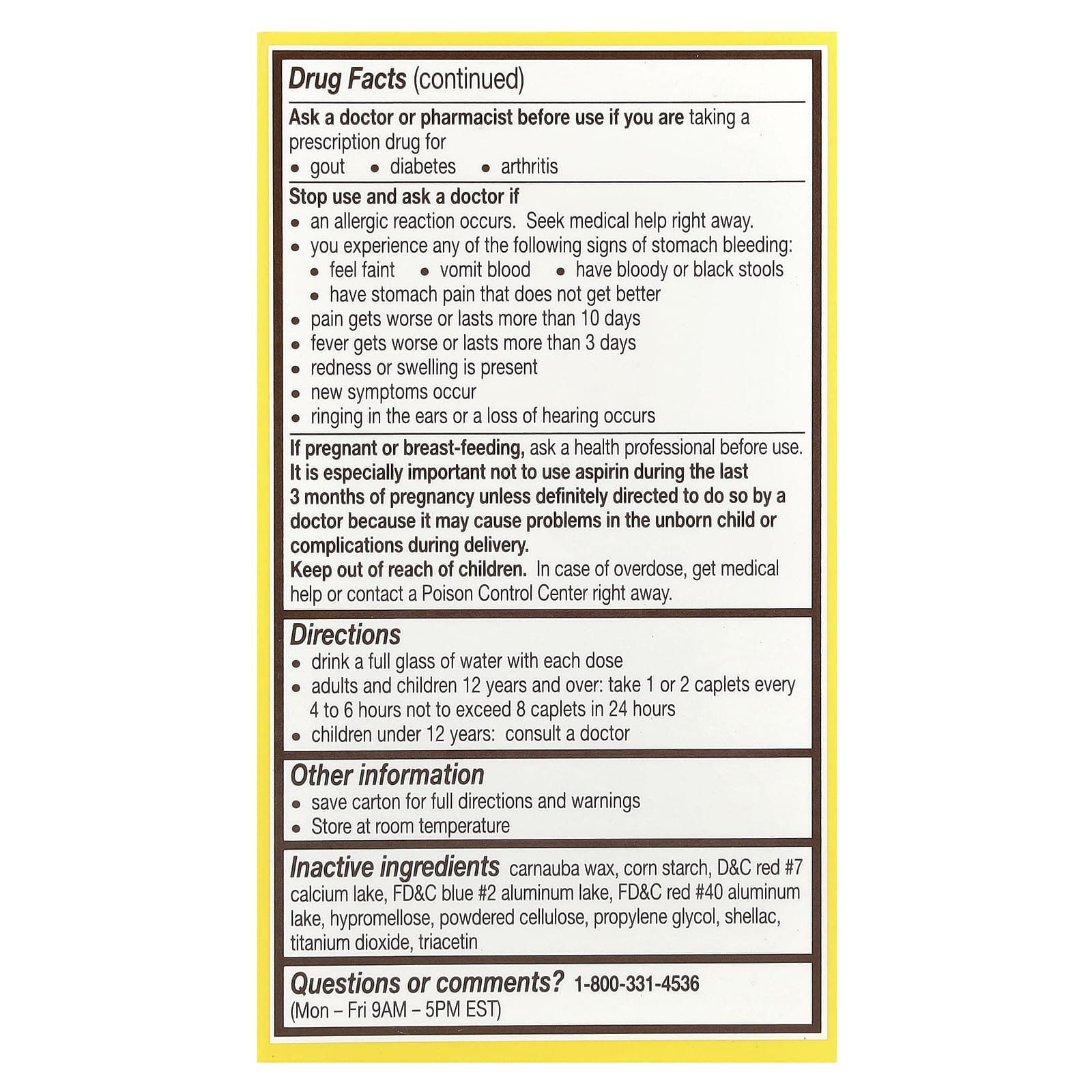Перед применением во время беременности или кормления грудью следует проконсультироваться с медицинским работником. Особенно важно не использовать аспирин в течение последних 3 месяцев беременности, если это не предписано врачом, поскольку это может вызвать проблемы у будущего ребенка или осложнения во время родов. Хранить в недоступном для детей месте. В случае передозировки немедленно обратитесь за медицинской помощью или свяжитесь с токсикологическим центром.