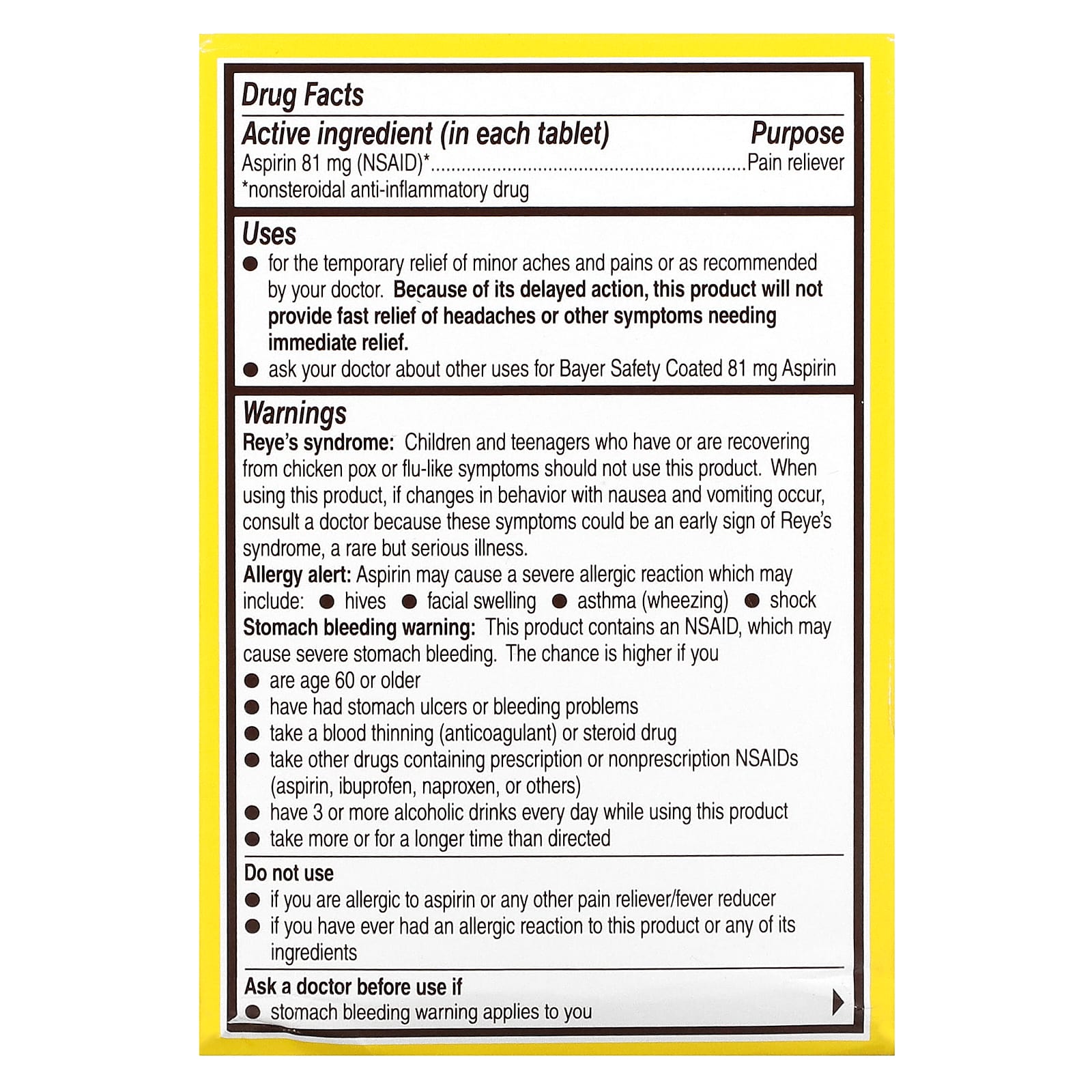Назначение. Для временного облегчения незначительных болей или в соответствии с рекомендациями врача. Из-за своего замедленного действия этот продукт не обеспечивает быстрого облегчения головной боли или других симптомов, требующих немедленного облегчения. Узнайте у врача о других способах применения аспирина 81 мг с защитным покрытием Bayer