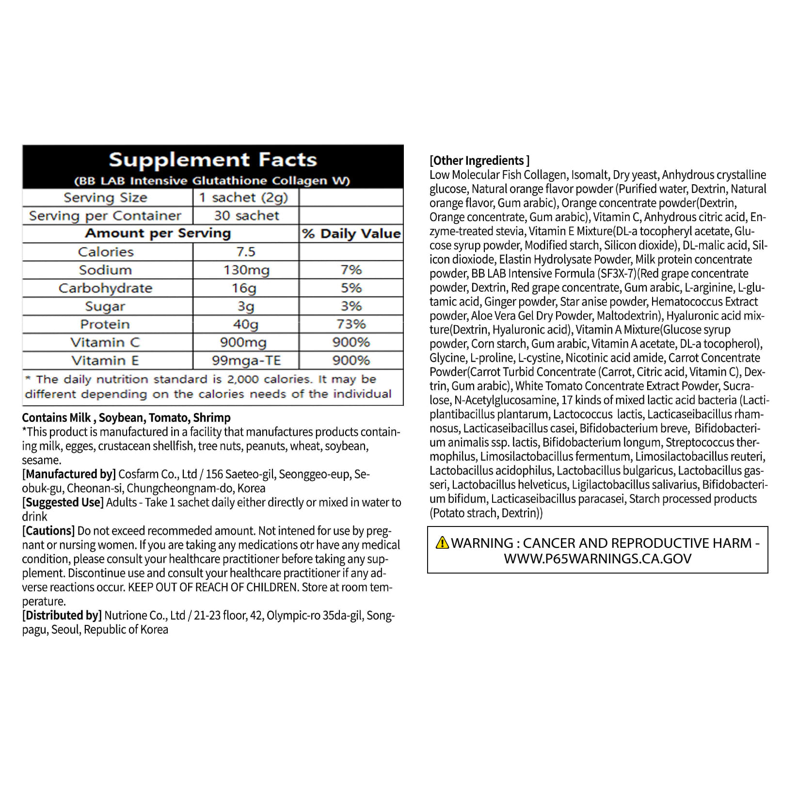 Низкомолекулярный рыбий коллаген, изомальт, сухих дрожжей, безводная кристаллическая глюкоза, порошок из натурального апельсинового ароматизатора (очищенная вода, декстрин, натуральный ароматизатор «Апельсин», аравийская камедь), порошок концентрата апельсина(декстрин, концентрат апельсина, аравийская камедь), витамин C, безводная лимонная кислота, обработанная ферментами стевия, смесь витаминов Е (dl-альфа токоферилацетат, глюкозный сироп, порошок, модифицированный крахмал, диоксид кремния), dl-яблочная кислота, диоксида кремния, порошок гидролизата эластина, порошок из концентрата молочного протеина, формула BB lab интенсивного действия (SF3x-7) (порошок из концентрата красного винограда, декстрин, концентрат красного винограда, аравийская камедь, l-аргинин, L-глутаминовая кислота, порошок из имбиря, порошок из аниса звездчатого, порошок из экстракта гематококка, сухой порошок из геля алоэ вера, мальтодекстрин), смесь гиалуроновой кислоты(декстрин, гиалуроновая кислота), витаминная смесь(порошок из глюкозного сиропа, кукурузный крахмал, аравийская камедь, ацетат витамина A, dl-альфа-токоферол), глицин, L-пролин, l-цистин, амид никотиновой кислоты, порошок из концентрата моркови(мутный концентрат моркови (морковь, лимонная кислота, витамин C), декстрин, аравийская камедь), порошок экстракта концентрата белого томата, сукралоза, н-ацетилглюкозамин, 17 видов смешанных молочнокислых бактерий (лактиплантибактерии плантарум (Lactilantibacterium plantarum), лактококк (Lactococcus lactis), лактобактерии рамнозус (Lacticaseibacillus rhamnosus), лактиказеибактерии казеи (Lacticaseibacillus casei), бифидобактерии бреве (Bifidobacterium breve), подвид Bifidobacterium animalis lactis, бифидобактерии лонгум (Bifidobacterium longum), стрептококк термофильный (Streptococcus thermophilus), ферментум (Limosilactobacillus fermentum), лимонилактобактерии реутери (Limosilactobacillus reuteri), ацидофильные лактобактерии (L. acidophilus), болгарская палочка (Lactobacillus bulgaricus), лактобактерии гассери (Lactobacillus gasseri), лактобактерии гельветикус (Lactobacillus helveticus), лигилактобактерии саливариус (Ligilactobacillus salivarius), бифидобактерии бифидум (Bifidobacterium bifidum), лактобактерии параказеи (Lacticaseibacillus paracasei), продукты, обработанные крахмалом (картофельный крахмал, декстрин)).