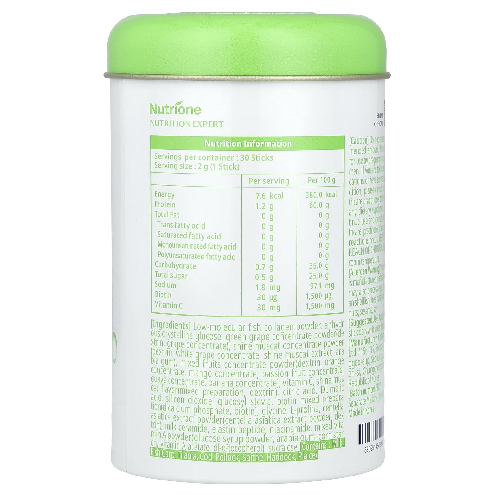 Порошок из низкомолекулярного рыбьего коллагена, безводная кристаллическая глюкоза, порошок концентрата зеленого винограда (декстрин, виноградный концентрат), концентрат мускатного блеска (декстрин, концентрат белого винограда, экстракт муската, аравийская камедь), фруктовый концентрат, порошок (декстрин, апельсиновый концентрат, концентрат манго, концентрат маракуйи, концентрат гуавы, банановый концентрат), витамина C, мускатный ароматизатор (смешанный препарат, декстрин), лимонная кислота, DL-яблочная кислота, диоксид кремния, глюкозил стевия, смешанный препарат биотина (дикальций фосфат, биотин), глицин, L-пролин, порошок экстракта центеллы азиатской (Centella asiatica), декстрин), молочный керамид, пептид эластина, никотинамид, смешанный порошок витамина А (порошок из глюкозного сиропа, аравийская камедь, кукурузный крахмал, ацетат витамина A, dl-a-токоферол), сукралоза.