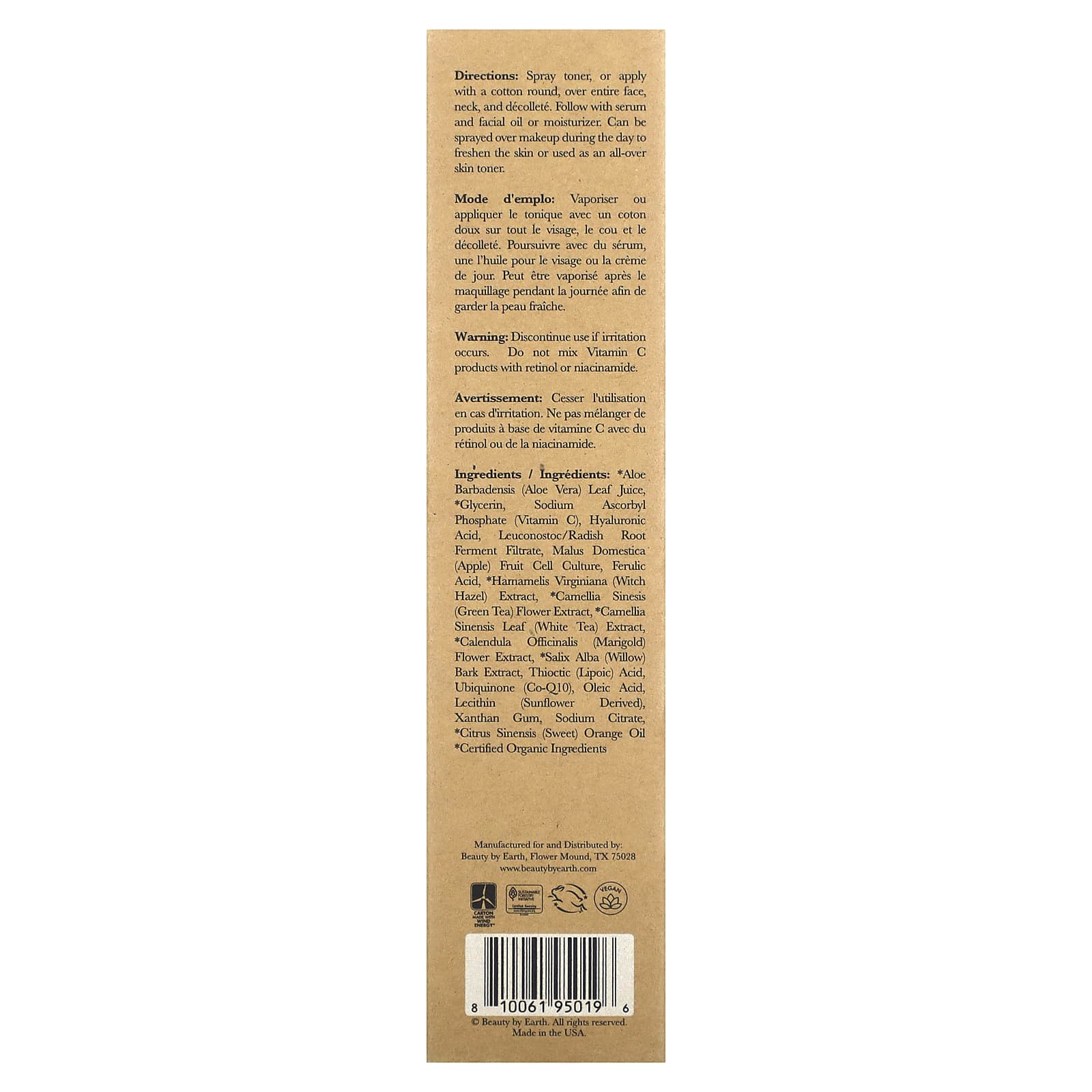 сок листьев алоэ вера (Aloe barbadensis)*, глицерин*, аскорбил фосфат натрия (витамин C), гиалуроновая кислота, лейконосток/ферментированный фильтрат корня редиса, культура клеток плодов яблони домашней (Malus domestica), феруловая кислота, экстракт гамамелиса (Hamamelis virginiana)*, экстракт цветков зеленого чая (Camellia sinensis)*, экстракт листьев белого чая (Camellia sinensis)*, экстракт цветков календулы (Calendula officinalis)*, экстракт коры ивы белой (Salix alba)*, тиоктовая (липоевая) кислота, убихинон (коэнзим Q10), олеиновая кислота, лецитин (полученный из подсолнечника), ксантановая камедь, цитрат натрия, масло сладкого апельсина (Citrus sinensis)*.
