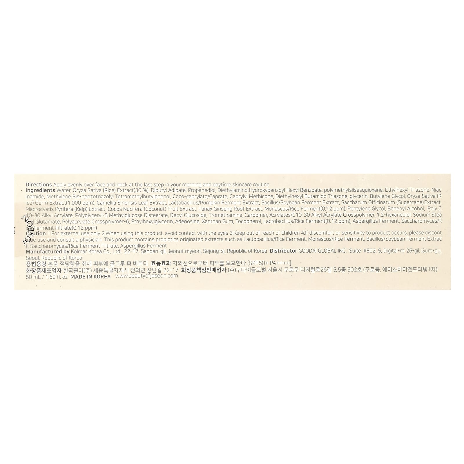 Вода, экстракт риса (Oryza sativa) (30%), дибутиладипат, пропандиол, диэтиламиногидроксибензоил гексил бензоат, полиметилсилсесквиоксан, этилгексил триазон, никотинамид, метилен бис-бензотриазолил тетраметил бутилфенол, кокосовый каприлат/капрат, каприлил метикон, диэтилгексил бутамидотриазон, глицерин, бутиленгликоль, экстракт зародышей Oryza sativa (ледяной) (1000 част. / млн), экстракт листьев зеленого чая (Camellia sinensis), ферментированный экстракт лактобактерий и тыквы, ферментированный экстракт бактерий/соевых бобов, экстракт сахарного тростника (Saccharum officinarum), экстракт морской водоросли (Macrocystis pyrifera), экстракт кокоса (Cocos nucifera), экстракт корня женьшеня (Panax ginseng), фермент из монаска / риса (0,12 част. / млн), пентилен гликоль, бегениловый спирт, поли c 10-30 алкил акрилат, полиглицерил-3 метилглюкозы дистеарат, децил глюкозид, трометамин, карбомер, акрилат/c10-30 алкил акрилат кроссполимер, 1,2-гександиол, натрия стеароил глутамат, полиакрилата кроссполимер-6, этилгексилглицерин, аденозин, ксантановая камедь, токоферол, лактобактерии / фермент риса (0,12 част. / млн), фермент аспергилла, сахаромицеты / фильтрат ледяной ферментации (0,12 част. / млн).