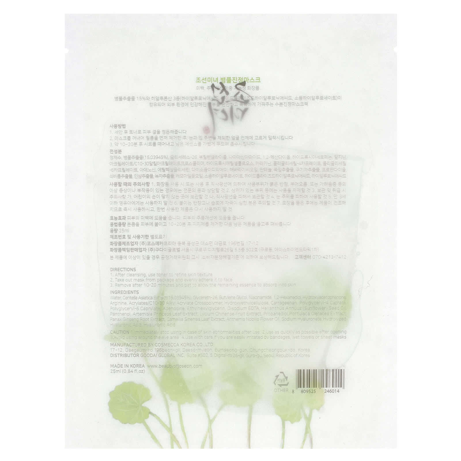 Вода, экстракт центеллы азиатской, глицерет-26, бутиленгликоль, никотинамид, 1,2-гександиол, гидроксиацетофенон, аргинин, кроссполимер акрилатов / C10-30 алкилакрилатов, гидроксиэтилцеллюлоза, каррагинан, полиглицерил-4 капрат, полиглицерил-6 каприлат, аденозин, этилгексилглицерин, двунатриевая эдта, подсолнечное масло, пантенол, экстракт листьев полыни (Artemisia princeps), экстракт плодов лициума китайского (Lycium chinense), пропандиол, экстракт портулака огородного (Portulaca oleracea), экстракт корня женьшеня, экстракт листьев камелии китайской, масло из цветков Anthemis nobilis, гиалуронат натрия, гидролизованная гиалуроновая кислота, гиалуроновая кислота.