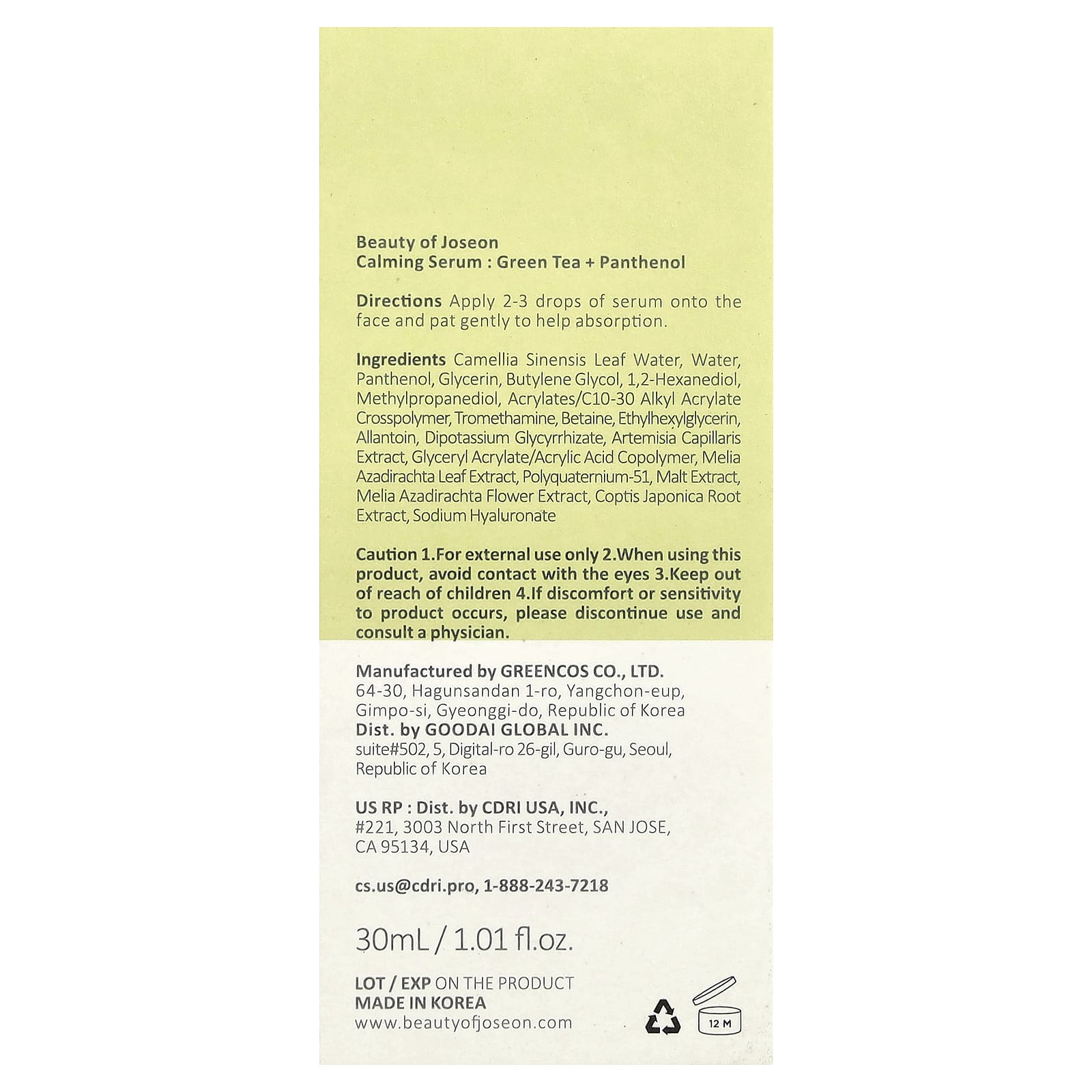 Вода из листьев зеленого чая (Camellia sinensis), вода, пантенол, глицерин, бутиленгликоль, 1,2-гександиол, метилпропандиол, акрилат/c10-30 алкил акрилат кроссполимер, трометамин, бетаин, этилгексилглицерин, аллантоин, дикалия глицирризат, экстракт полыни волосовидной (Artemisia capillaris), сополимер глицерил акрилата/акриловой кислоты, экстракт листьев дерева ним (Melia azadirachta), поликватерниум-51, экстракт солода, экстракт цветков дерева ним (Melia azadirachta), экстракт корня коптиса японского (Coptis japonica), гиалуронат натрия.
