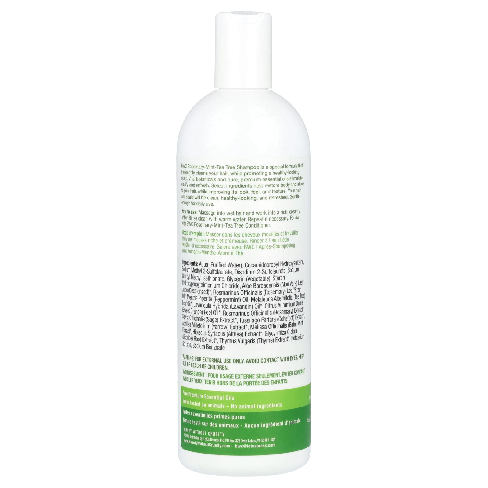 Нанесите массажными движениями на влажные волосы до образования густой кремовой пены. Смойте теплой водой. При необходимости повторите. Затем нанесите кондиционер BWC с розмарином, мятой и чаем.