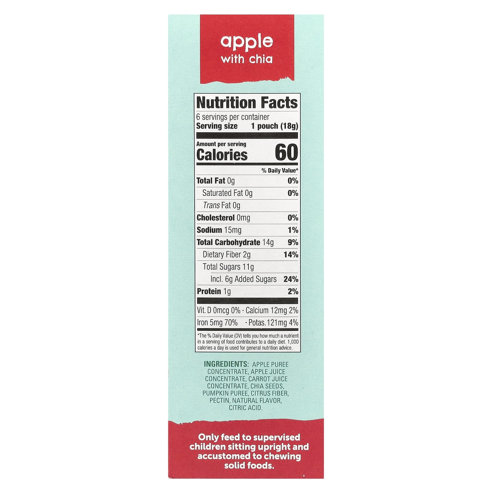 Яблоко с чиа: Концентрат яблочного пюре, концентрат яблочного сока, концентрат морковного сока, семена чиа, тыквенное пюре, цитрусовая клетчатка, пектин, натуральный ароматизатор, лимонная кислота.