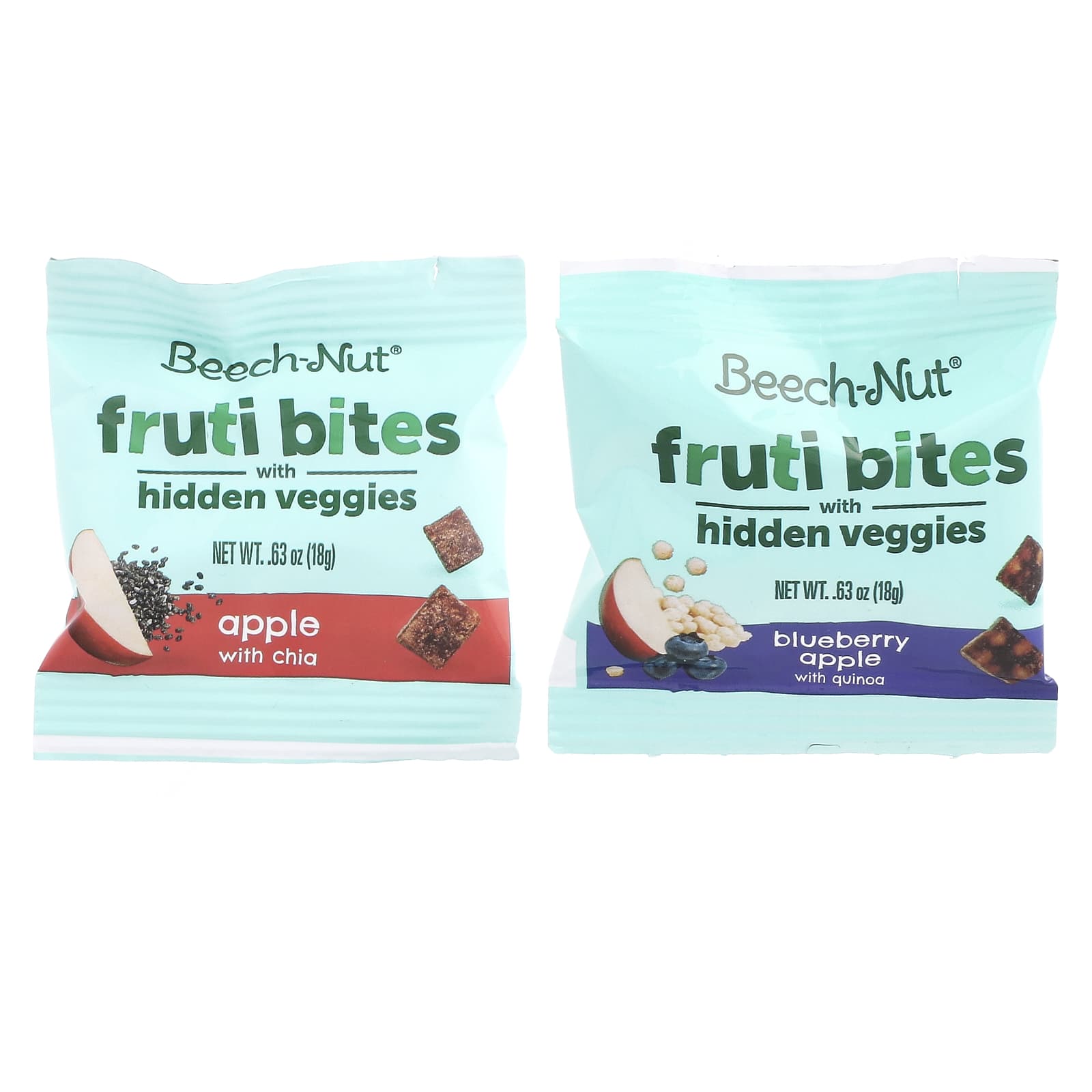 New Beech-Nut Fruti Bites со скрытыми овощами - это мягкие, небольшие по размеру жевательные таблетки для самых маленьких! Эти восхитительные фруктовые закуски сделаны из фруктов и овощей и имеют больший размер. Они идеально подходят для хранения продуктов в буфете, ланчбоксов и в дороге! Каждая упаковка содержит 12 пакетиков с индивидуальным размером порции и двумя фруктовыми вкусами: Голубика, яблоко, киноа и яблочный чиа.
