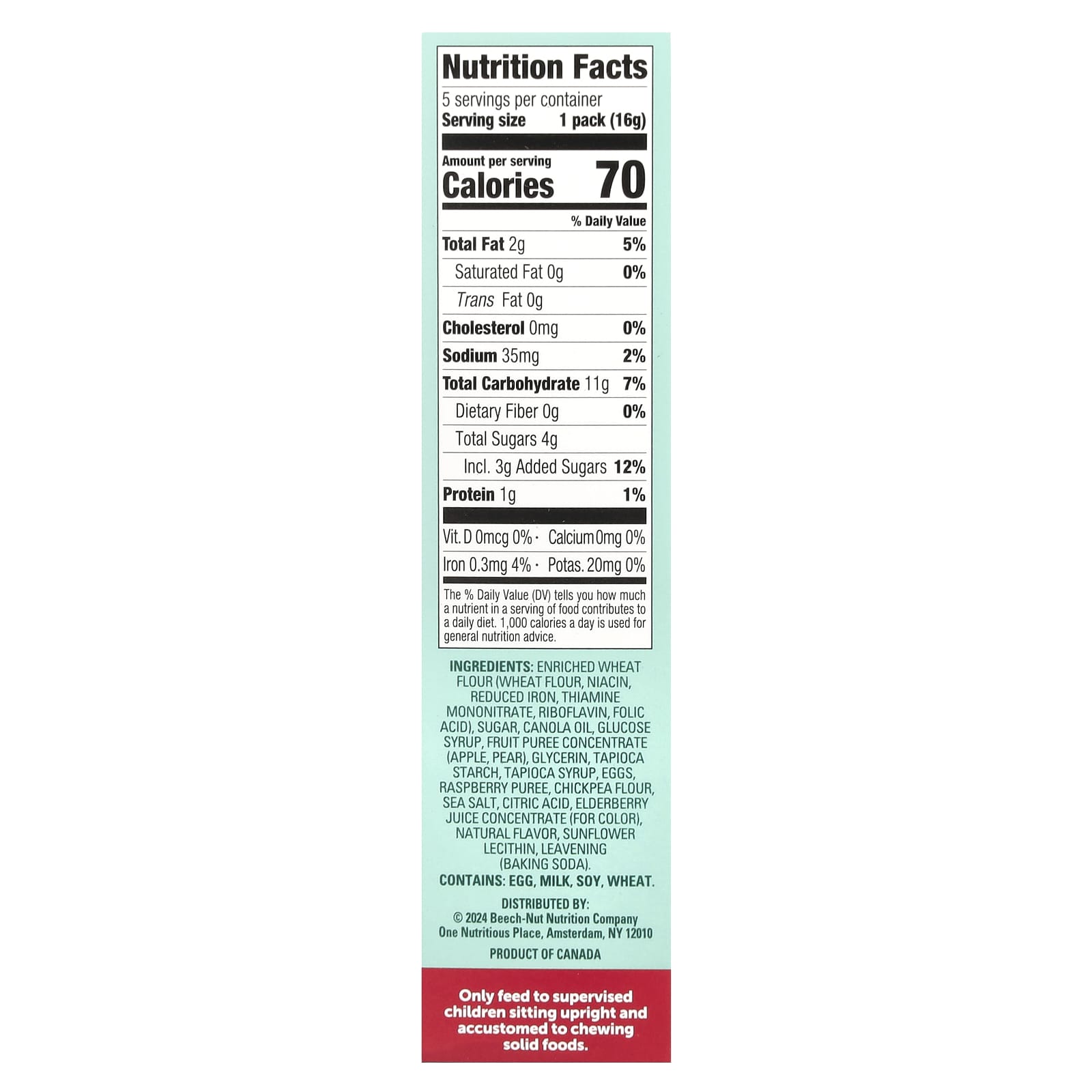 Обогащенная пшеничная мука (пшеничная мука, ниацин, восстановленное железо, тиамина мононитрат, рибофлавин, фолиевая кислота), сахара, рапсовое масло, глюкозный сироп, концентрат фруктового пюре (яблоко, груша), глицерин, тапиоковый крахмал, тапиоковый сироп, яйца, малиновое пюре, нутовая мука, морская соль, лимонная кислота, концентрат сока бузины (краситель), натуральный ароматизатор, подсолнечный лецитин, разрыхлитель (пищевая сода).